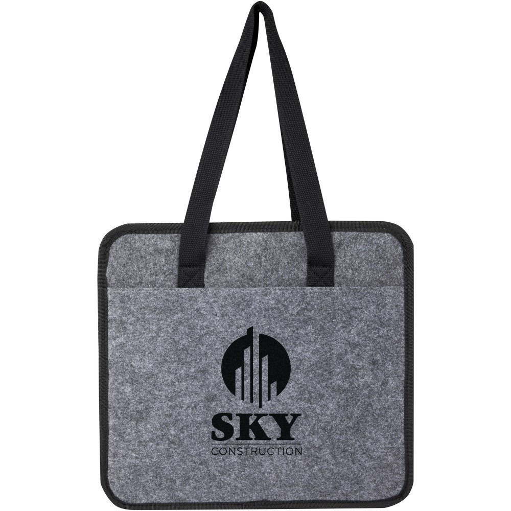 Puha és tartós, kiváló minőségű, GRS tanúsítvánnyal rendelkező újrahasznosított filcből készült összecsukható táska. 2 nagy rekesszel, megerősített alsó lapokkal, elülső zsebbel, hálós zsebbel és 2 hosszú szövött pamut füllel (30 x 2,5 cm). Ideális elektromos járműve töltőkábeleinek tárolására, élelmiszerek szállítására vagy egyszerűen a rend fenntartására az autóban vagy otthon. Minden erőfeszítés nélkül a helyére hajtható, és egy rugalmas pánt gondoskodik arról, hogy szépen összecsukva maradjon. Zárt mélység: 4,5 cm. Nyitott mélység: 48 cm. Emblémázás: Hímzés, Szitanyomás