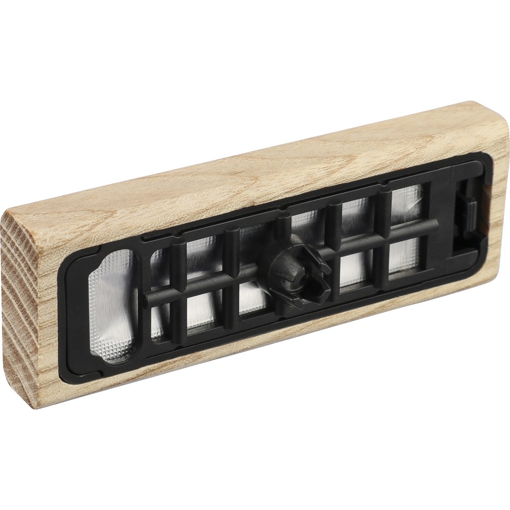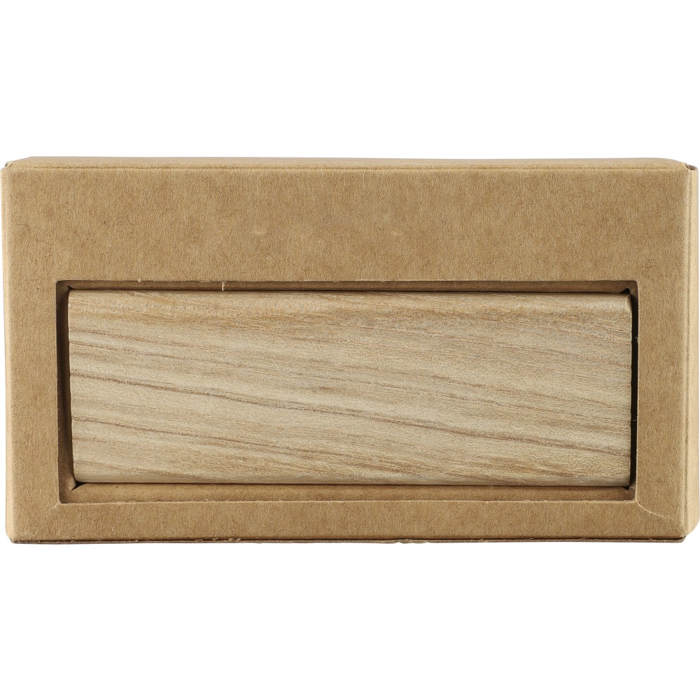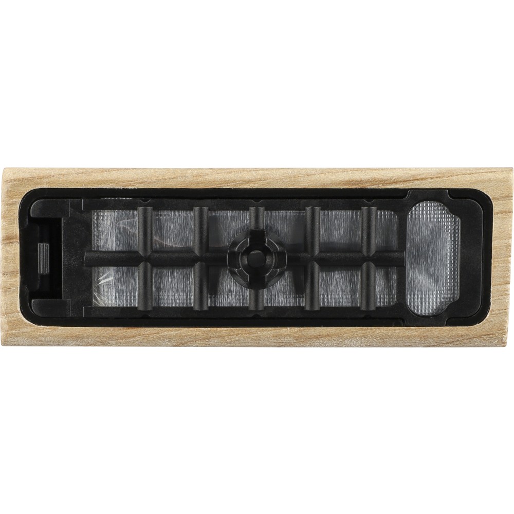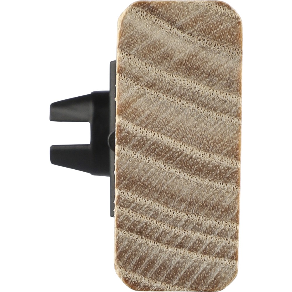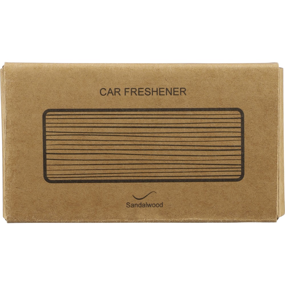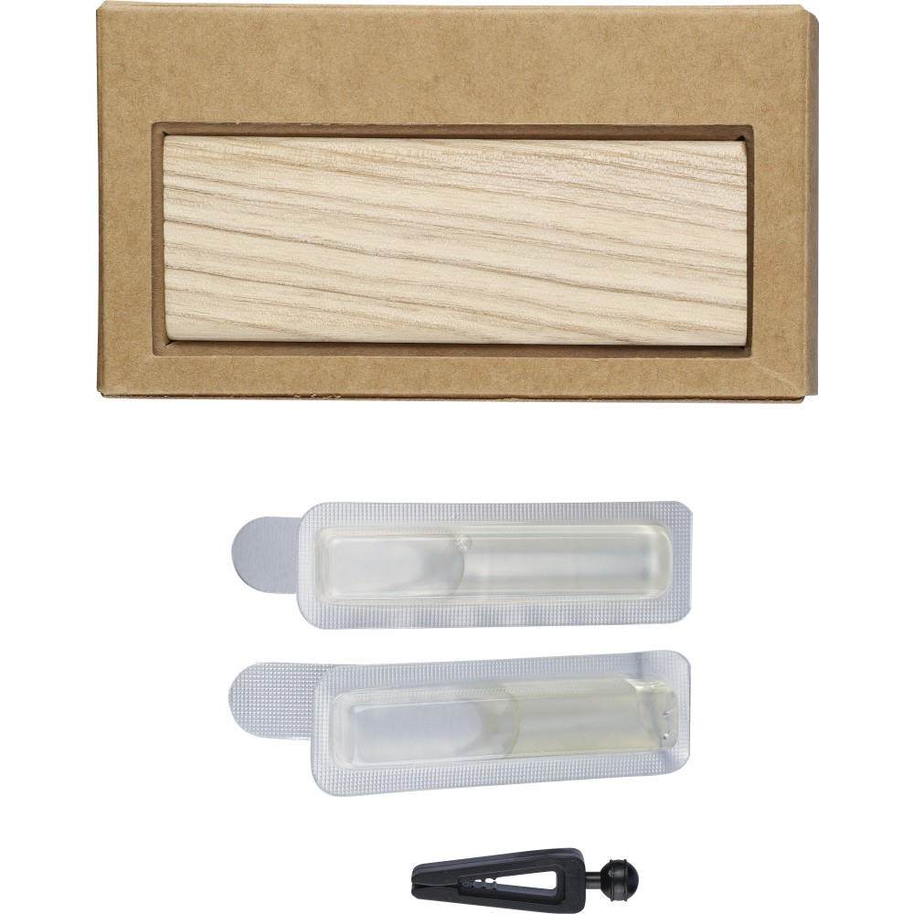 Natúr bükkfából készült autós légfrissítő, 2 × 3 g alkoholmentes szantálfa illattal (egy előre töltve, egy utántöltőként). ABS csipesszel ellátva a szellőzőrácsra történő rögzítéshez. Illusztrációval ellátott barna kartondobozba csomagolva. Emblémázás: Gravírozás, Tamponnyomás