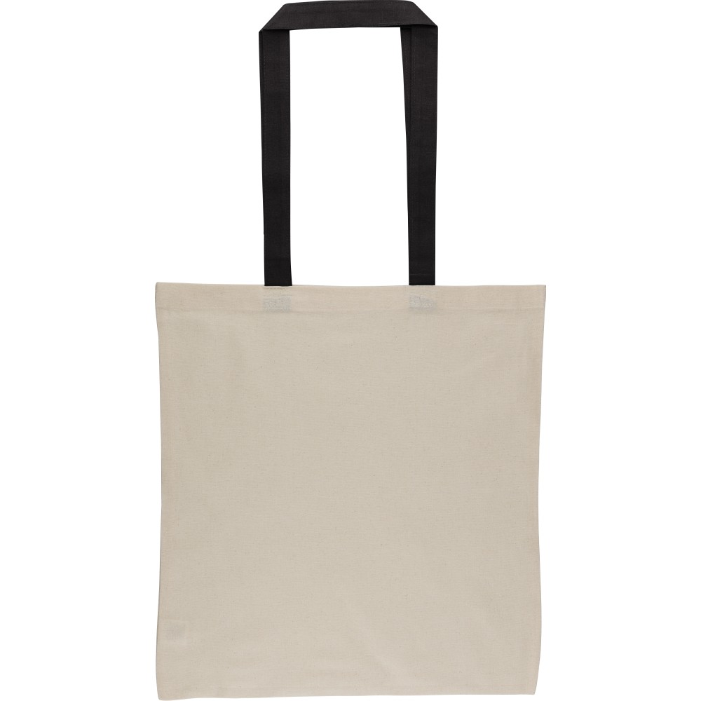 Oeko-Tex minősítésű, 140 g/m2 pamutból készült bevásárlótáska natúr színben, színes fülekkel. Mérete 38 × 42 cm, a fülek hossza 70 cm, szélessége 2,5 cm. Oeko-Tex címkével ellátva.