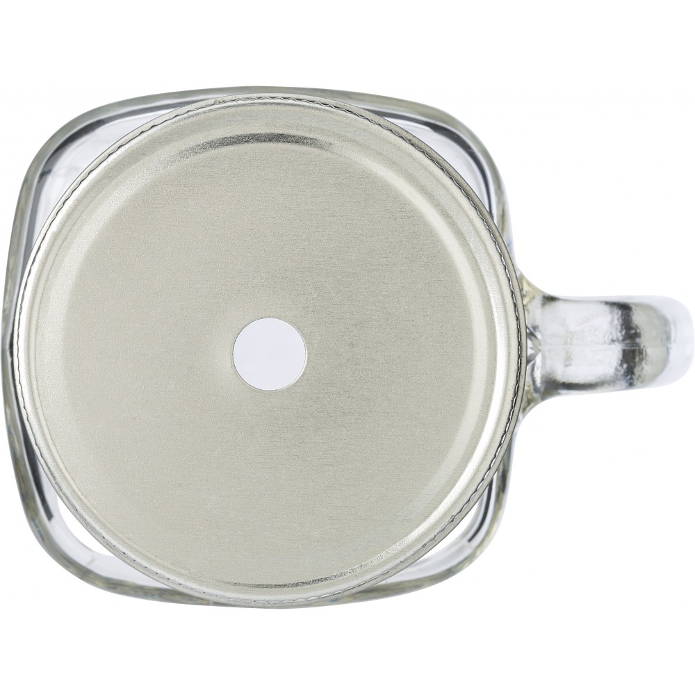 Üvegkorsó ezüst színű fedéllel, szívószállal. 400 ml űrtartalom. Emblémázható felület: 40 x 50 mm. BPA-mentes műanyag. Emblémázás: Bögredekor