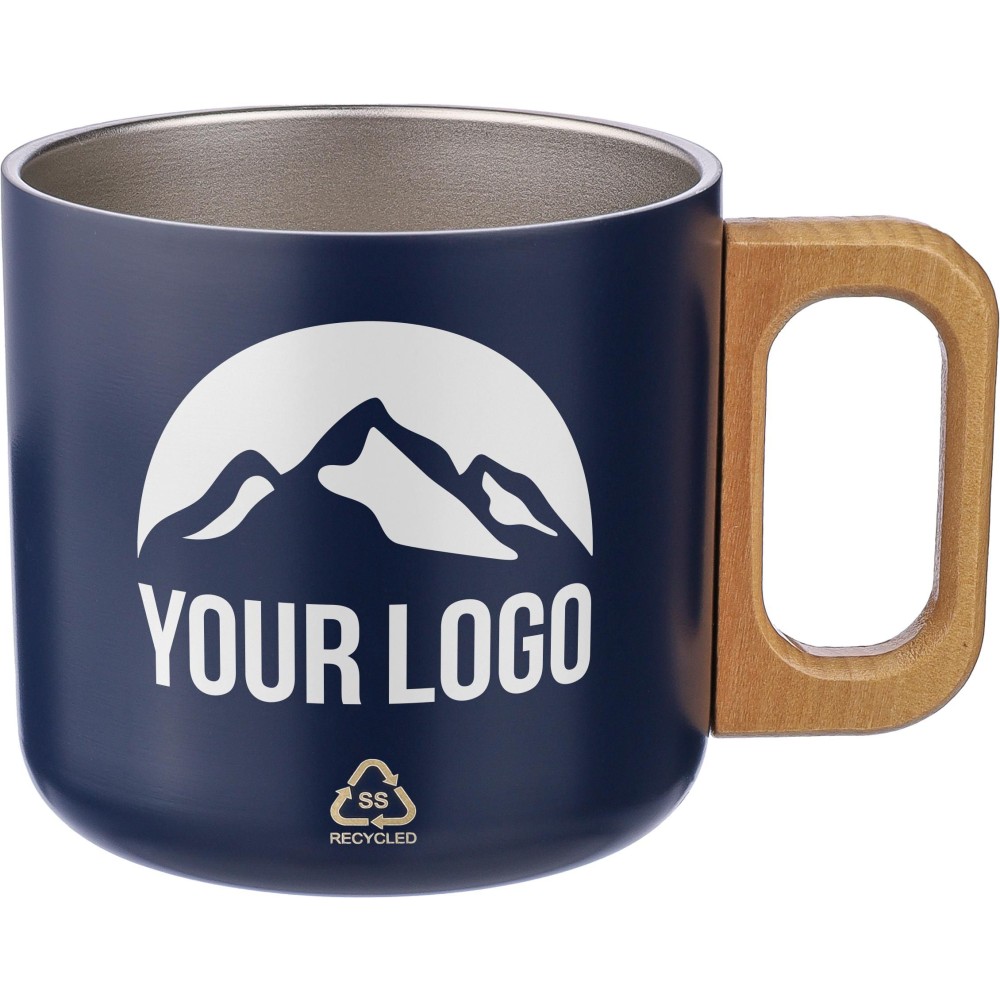 Duplafalú bögre fa fogantyúval. Mosogatógépben nem mosható. Gravírozott újrahasznosított rozsdamentes acél logóval. Egyenként barna kartondobozba csomagolva. Anyaga: újrahasznosított rozsdamentes acél. Űrtartalom: 400 ml. Emblémázás: Gravírozás