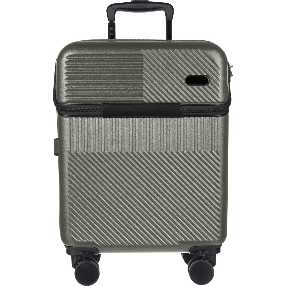 Gurulós bőrönd cipzáras laptop zsebbel, 8 kerékkel és háromszintű fogantyúrendszerrel. Beépített számzár és külön lapocska a lézergravírozáshoz. USB porttal. Emblémázás: Gravírozás