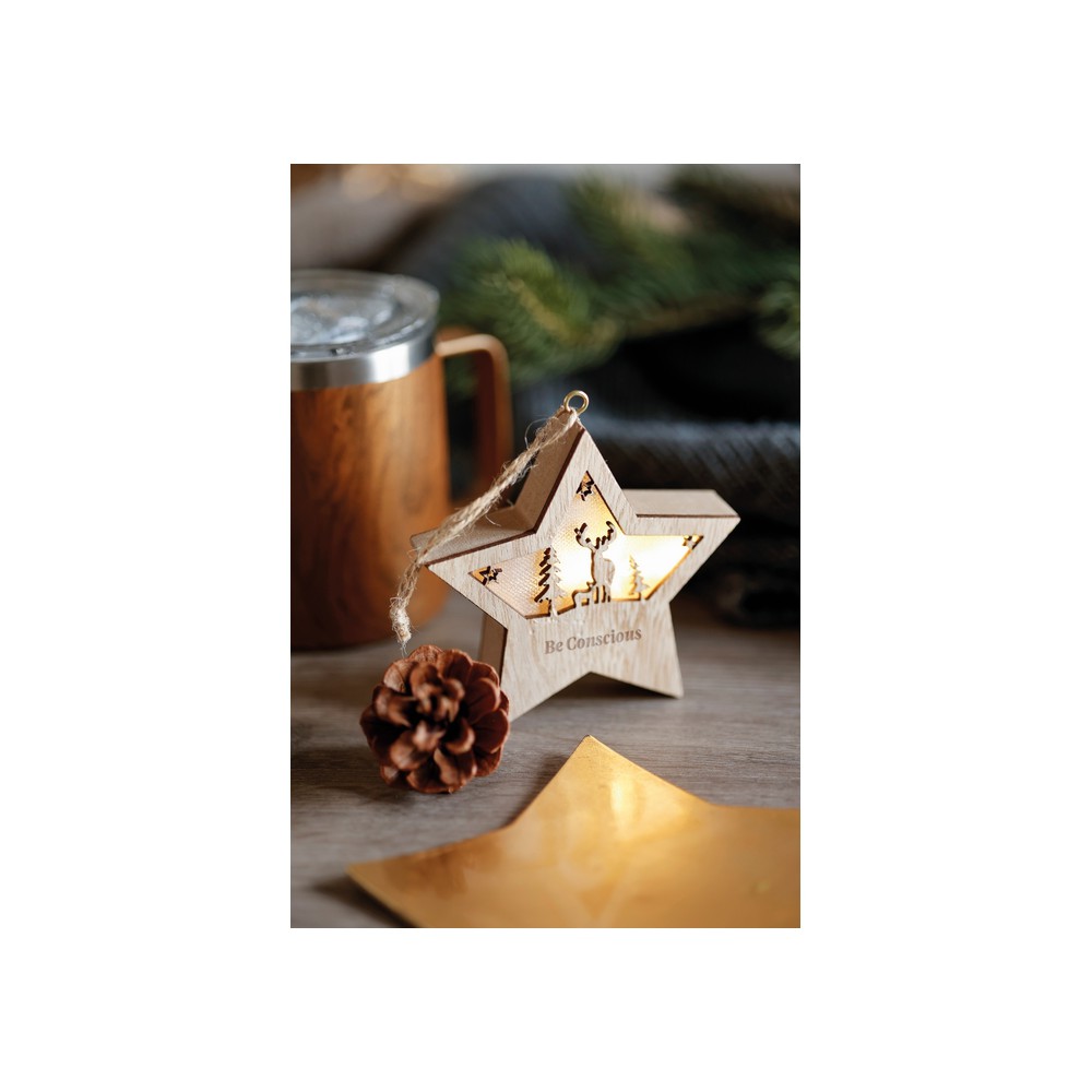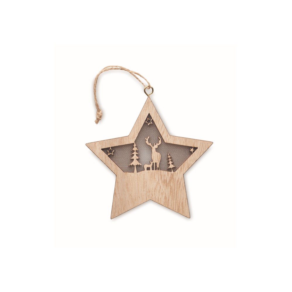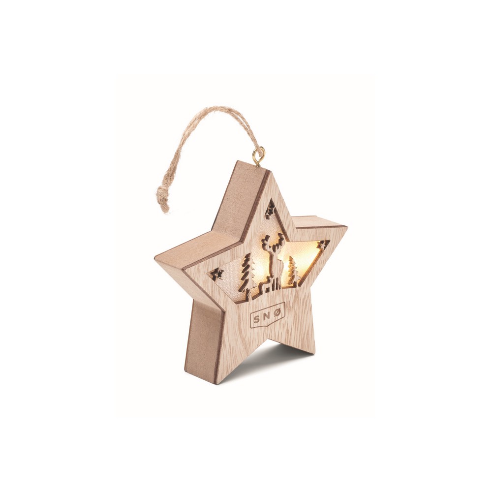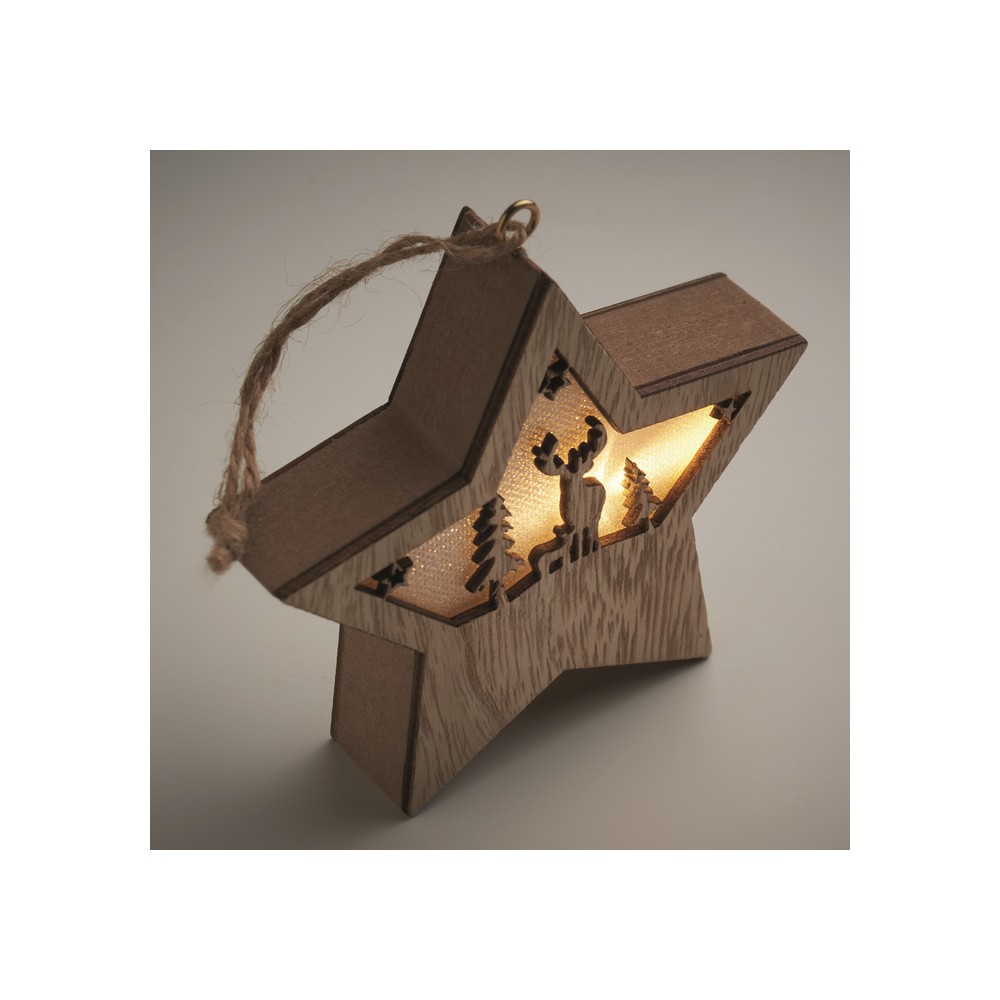 MDF karácsonyfadísz világítással, karácsonyi motívummal, akasztózsinórral. A működéshez szükséges 3 db LR44 elemmel szállítjuk. Emblémázás: Gravírozás