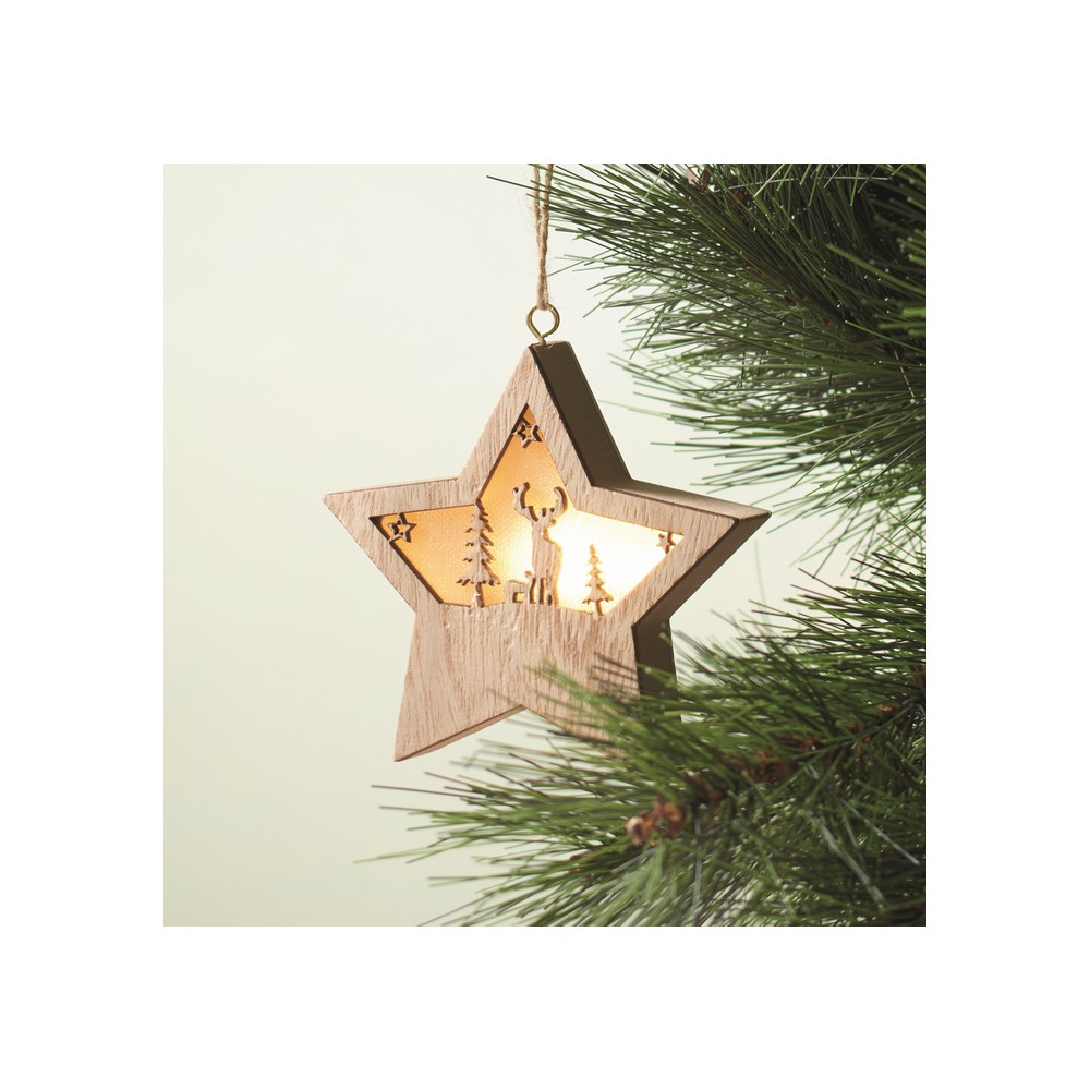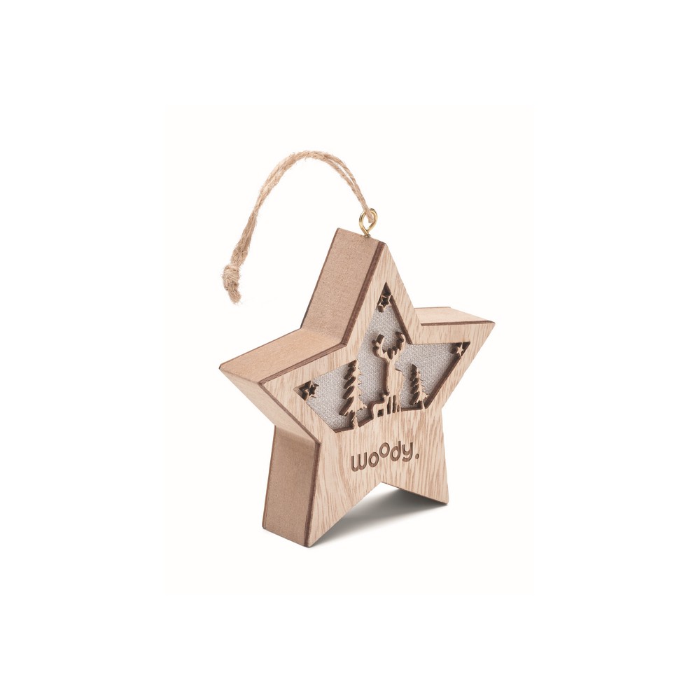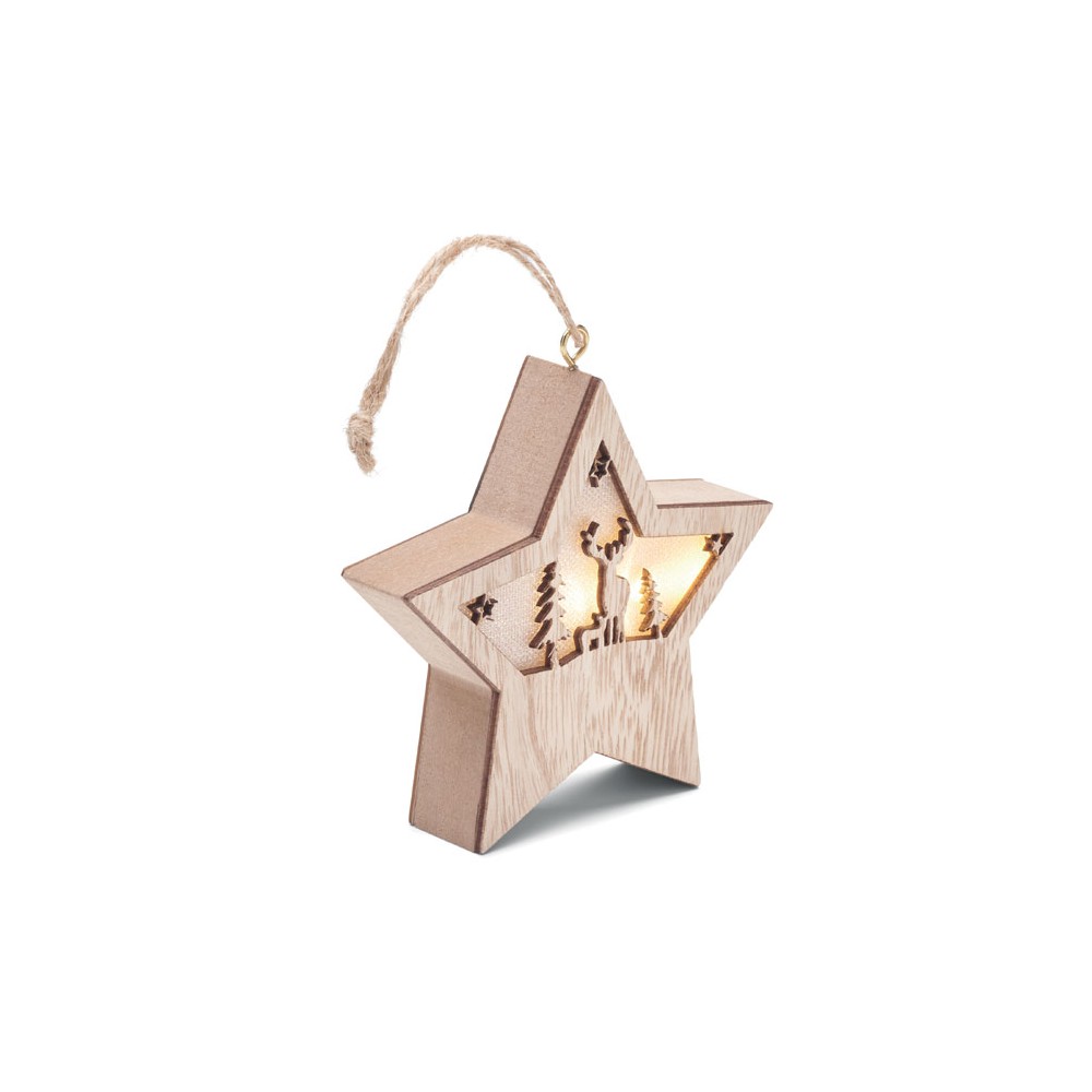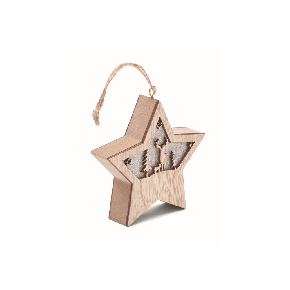 MDF karácsonyfadísz világítással, karácsonyi motívummal, akasztózsinórral. A működéshez szükséges 3 db LR44 elemmel szállítjuk. Emblémázás: Gravírozás