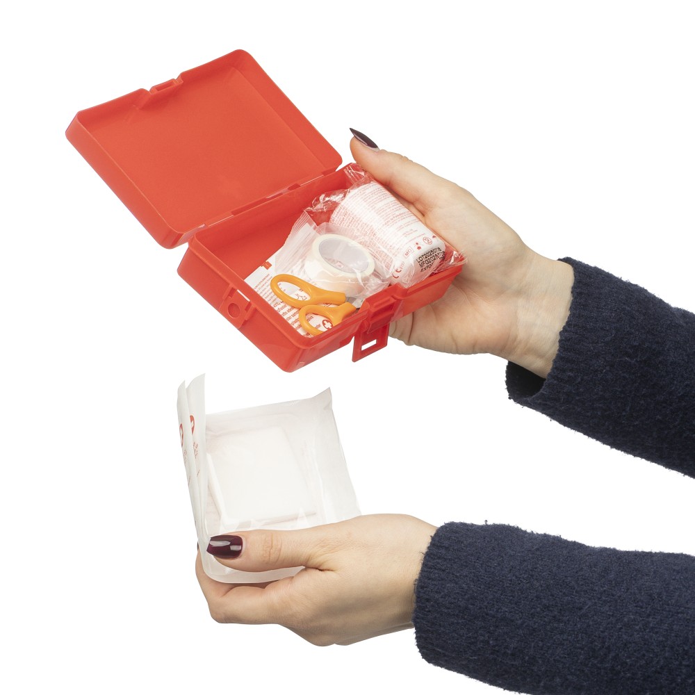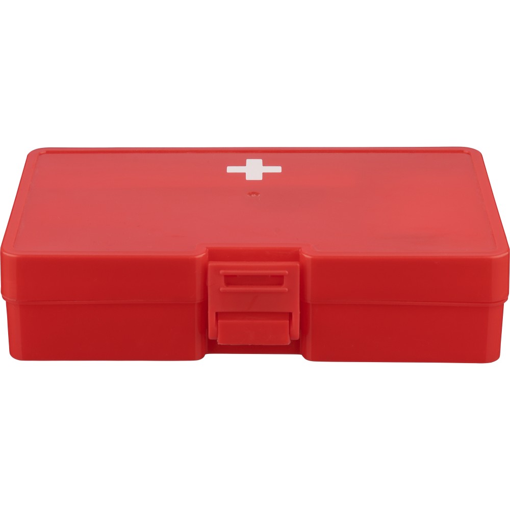 PP anyagból készült elsősegélykészlet piros tokban, a felső részen fehér kereszttel és csatos záródással. Tartalma: 2 nemszőtt törlőkendő, 5 ragtapasz, 4 alkoholos törlőkendő, 1 olló, 1 tekercs 450 cm hosszú gézkötés és 1 tekercs 450 cm hosszú ragasztószalag. Emblémázás: Tamponnyomás