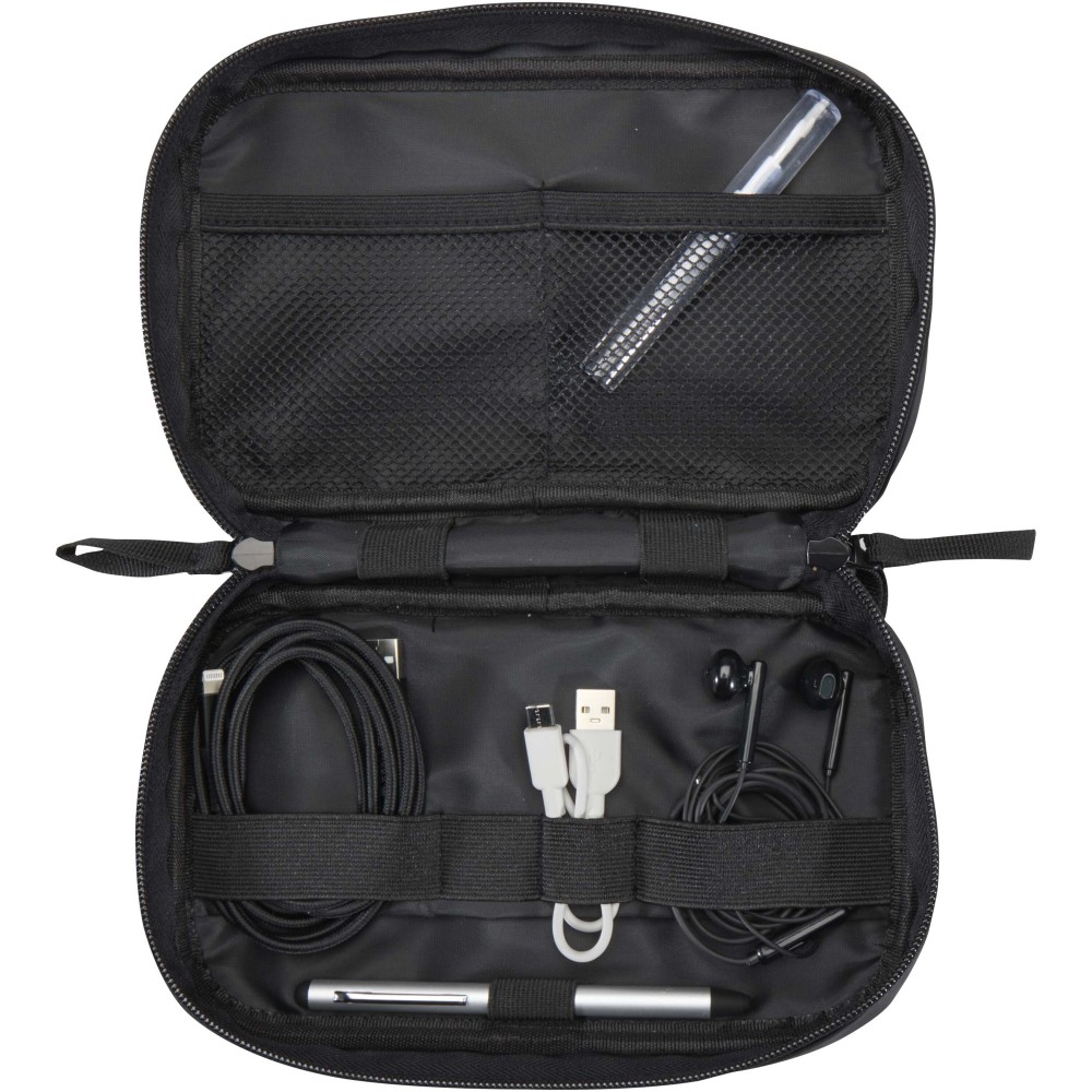Ez az 1 literes technikai rendszerező táska GRS tanúsítvánnyal rendelkező, újrahasznosított PU-műbőrből készült, színben harmonizáló RPET béléssel, kifejezetten utazók, távmunkában dolgozók és a technikai kiegészítők kedvelői számára tervezve. A kompakt méretnek köszönhetően könnyen szállítható hátizsákban vagy kézipoggyászban, cipzáras főrekesze pedig olyan praktikus rendszerező funkciókat tartalmaz, mint a rugalmas tolltartó pánt, két hálós zseb a fülhallgatók és apró kiegészítők számára, egy megerősített elválasztó, valamint több rugalmas pánt a kábelek, USB-meghajtók és töltők biztonságos rögzítéséhez. A külső részen egy tépőzáras elülső zseb található a gyors hozzáférés érdekében, a kényelmes hordozást pedig egy hevederes fül segíti. A vízlepergető bevonattal ellátott termék hatékony védelmet nyújt az alapvető eszközök számára minden helyzetben.