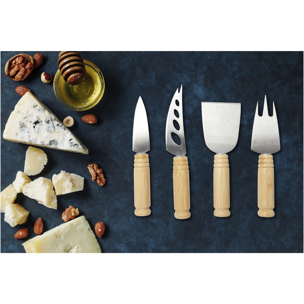 4 részes bambusz sajtkészlet, egy sajtlapáttal (13,3 x 4,7 cm), 2 sajtkéssel (13,5 x 2 cm és 15,3 x 2,5 cm) és egy sajtvillával (14 x 3,5 cm). Az ergonomikus fogantyú kialakítása, a jó méret és a kerek fogantyú megkönnyíti a fogást. Az összes szerszám fogantyúi 7 cm hosszúak, átmérője 1,9 cm. Különböző kemény és lágy sajtok feltekerésére, vágására, szeletelésére, vékony lapok reszelésére és kenésére tervezték. Könnyűek és helytakarékosak, könnyen tárolhatók a konyhaszekrényben, tökéletesek tálcákhoz vagy étkezőasztalokhoz. A felhasznált bambusz forrása és előállítása a fenntartható szabványok szerint történik. Emblémázás: Gravírozás, Tamponnyomás