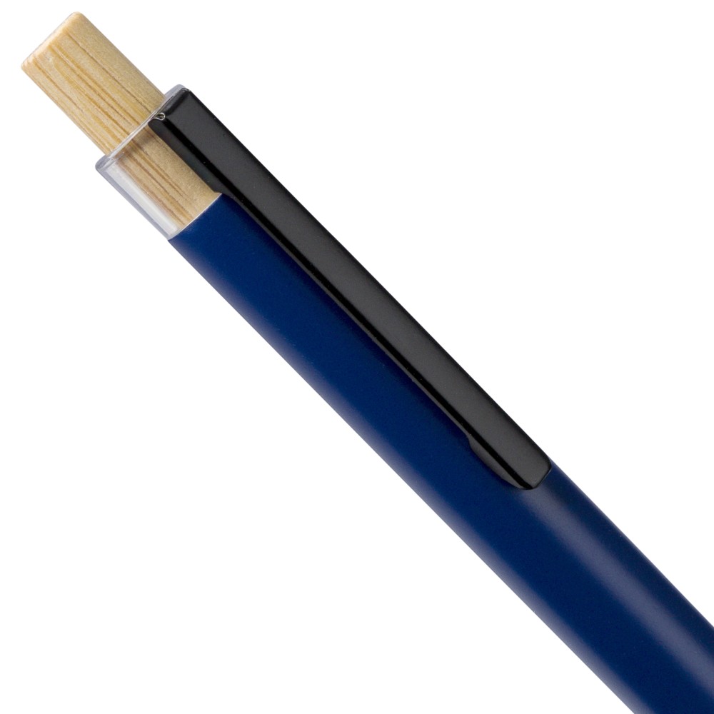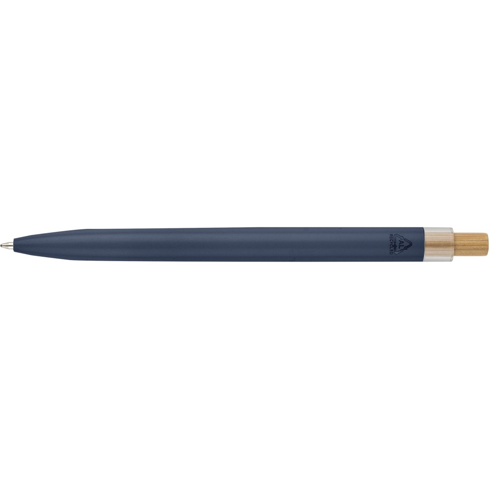 Újrahasznosított alumíniumból készült, lakkozott, nyomógombos golyóstoll bambusz nyomógombbal, rPET díszítéssel és fém klippel. A tolltesten gravírozott recycled (újrahasznosított) alapanyagra utaló logó található. Megközelítőleg 700 méter íráshossz, kék tollbetéttel.