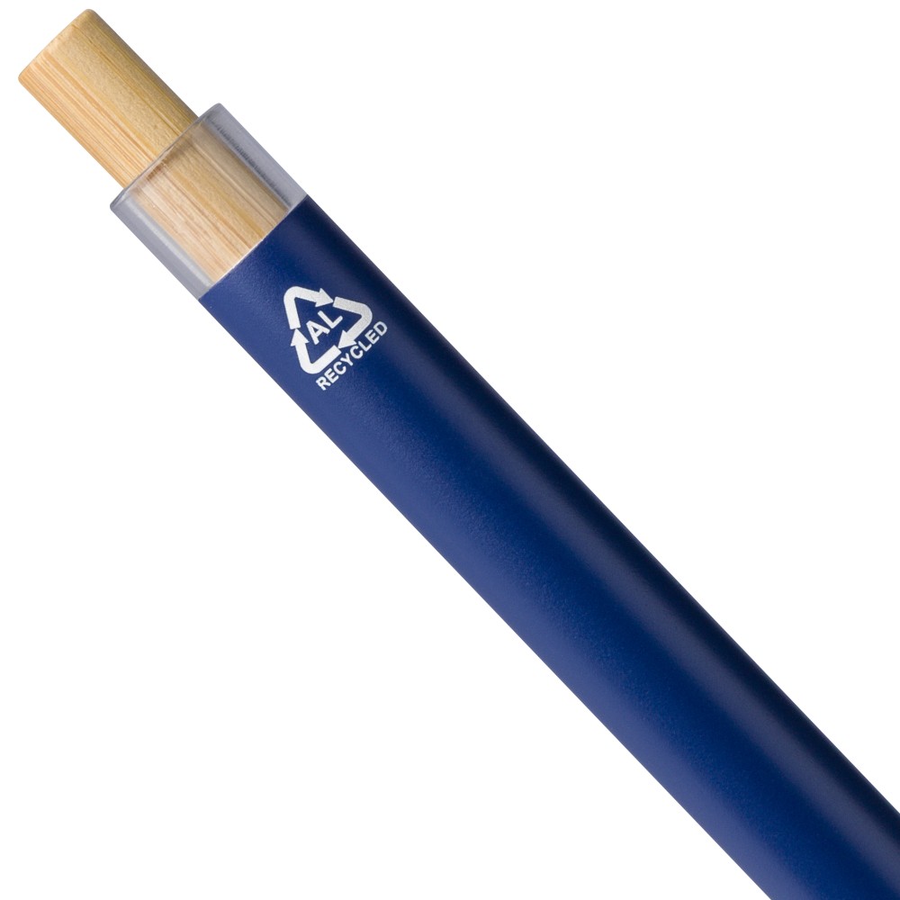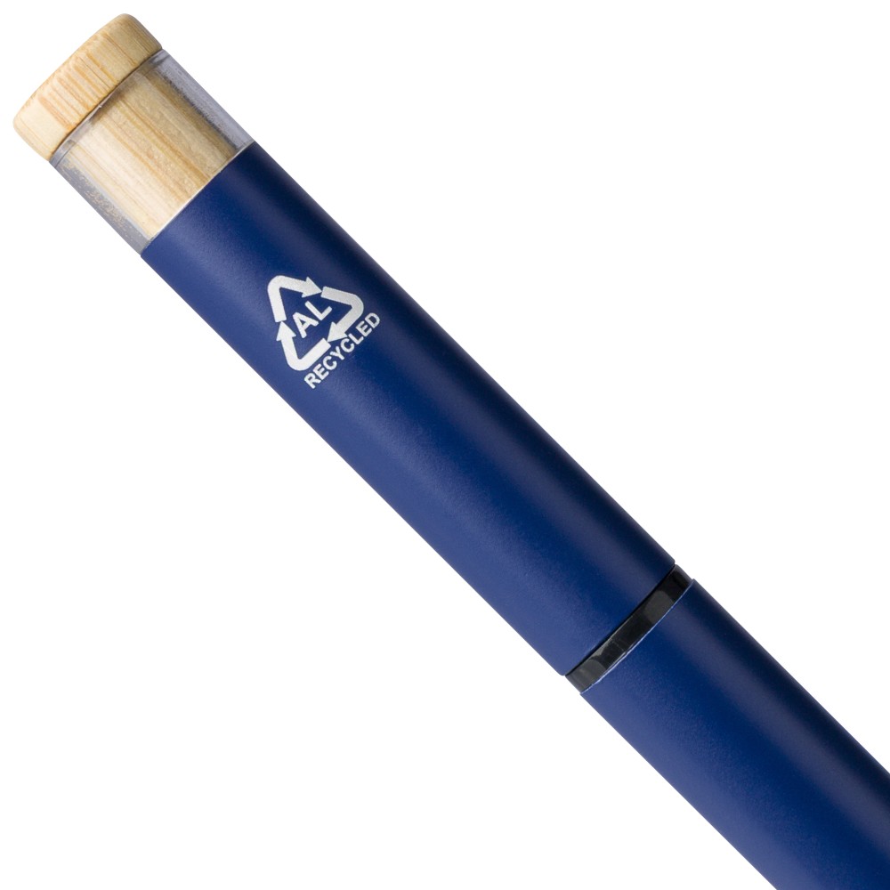 Újrahasznosított alumíniumból készült, lakkozott tollszett golyóstollal és rollerball tollal. A golyóstoll bambusz nyomógombbal, rPET díszítéssel és fém klippel rendelkezik, míg a rollerball toll bambusz/rPET kupakdíszítéssel és hozzá illeszkedő klippel. A tolltesten gravírozott recycled (újrahasznosított) alapanyagra utaló logó található mindkét toll esetében. A golyóstoll kb. 700 méter, a roller toll kb. 500 méter íráskapacitású, mindkettő kék színű tollbetéttel. Színes, újrahasznosított kartonból készült ajándékdobozba csomagolva.