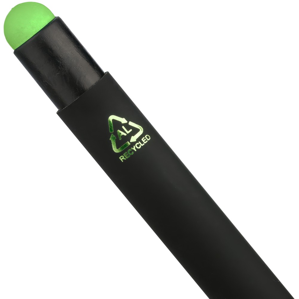 Újrahasznosított alumínium golyóstoll fekete, gumírozott felülettel és kék tollbetéttel. Színben illeszkedő kiegészítőkkel ? beleértve a belső tolltestet és az érintőképernyőkhöz használható stylus véget ?, amelyek kifinomult kontrasztot alkotnak gravírozáskor. Nyomógombos szerkezettel és gravírozott újrahasznosított logóval.