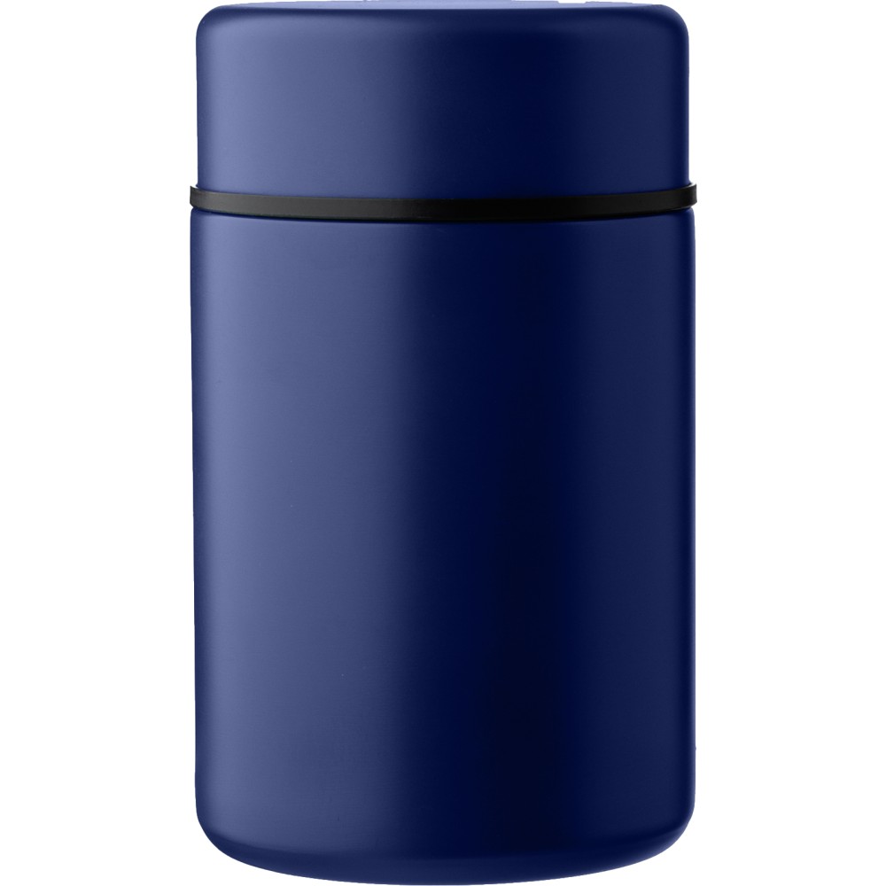 Rozsdamentes acél, duplafalú ételtartó (460 ml) fekete PP kanállal és a tartó színével megegyező szilikon markolattal, belső része 304-es, külső része 201-es rozsdamentes acél, PP fedéllel kerül szállításra, darabonként barna kartondobozba csomagolva. Emblémázás: Gravírozás, Tamponnyomás