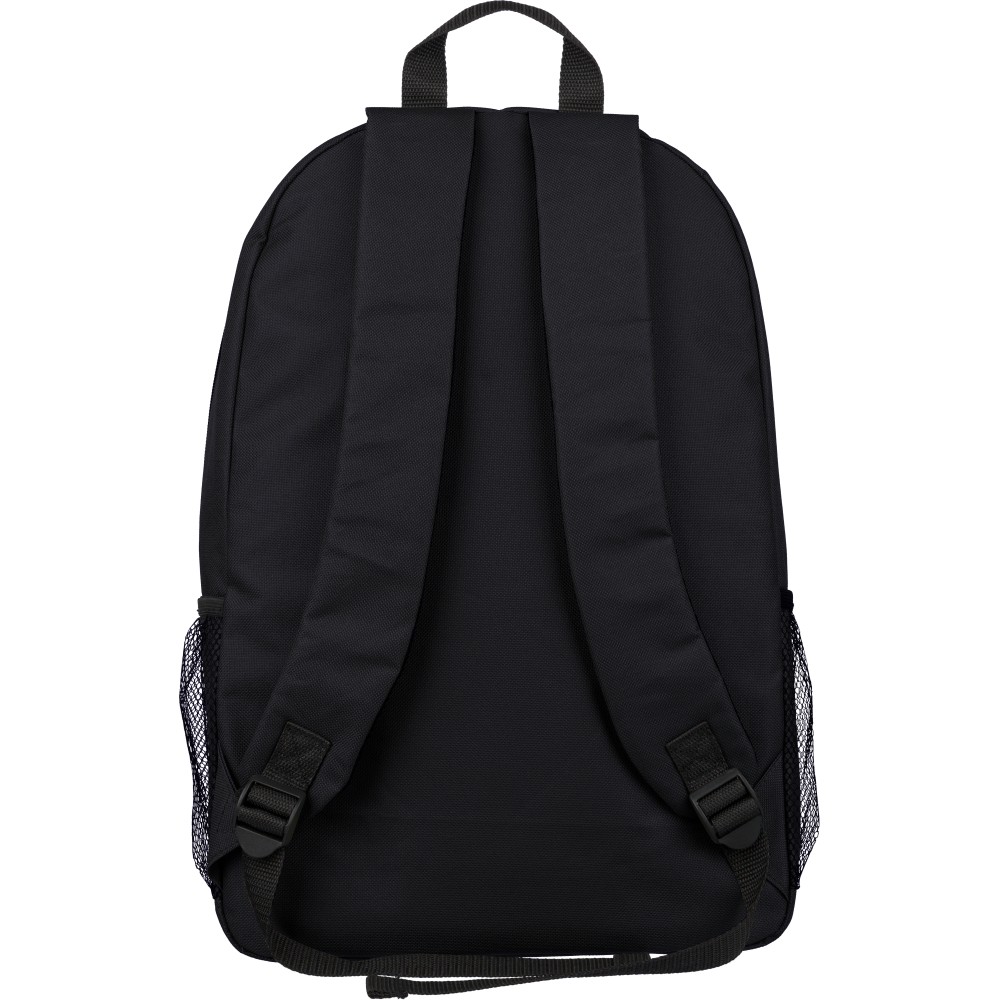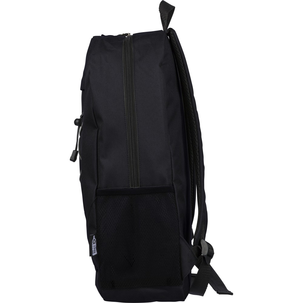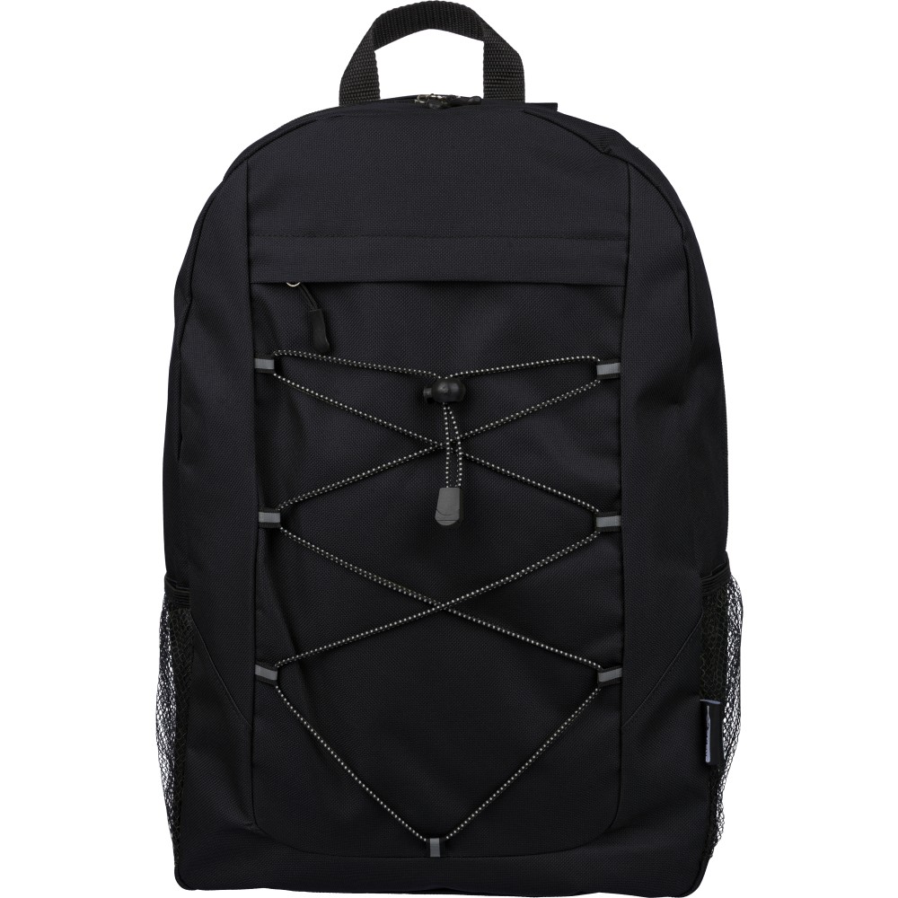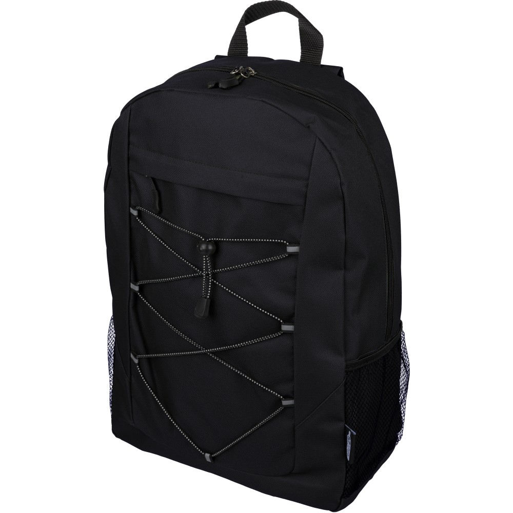 RPET poliészter 600D anyagból készült hátizsák húzózsinóros záródással és nagy cipzáras fő rekesszel. Hálós oldalzsebekkel, rugalmas elülső pántokkal, dekorációhoz kialakított kis elülső cipzáras zsebbel és állítható vállpántokkal rendelkezik. A terméken rPET alapanyagra utaló címke található. Emblémázás: Szitanyomás