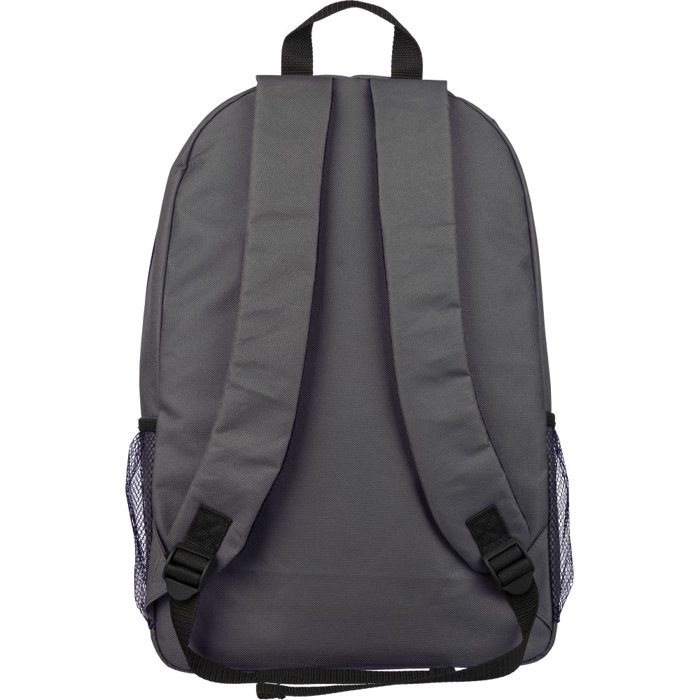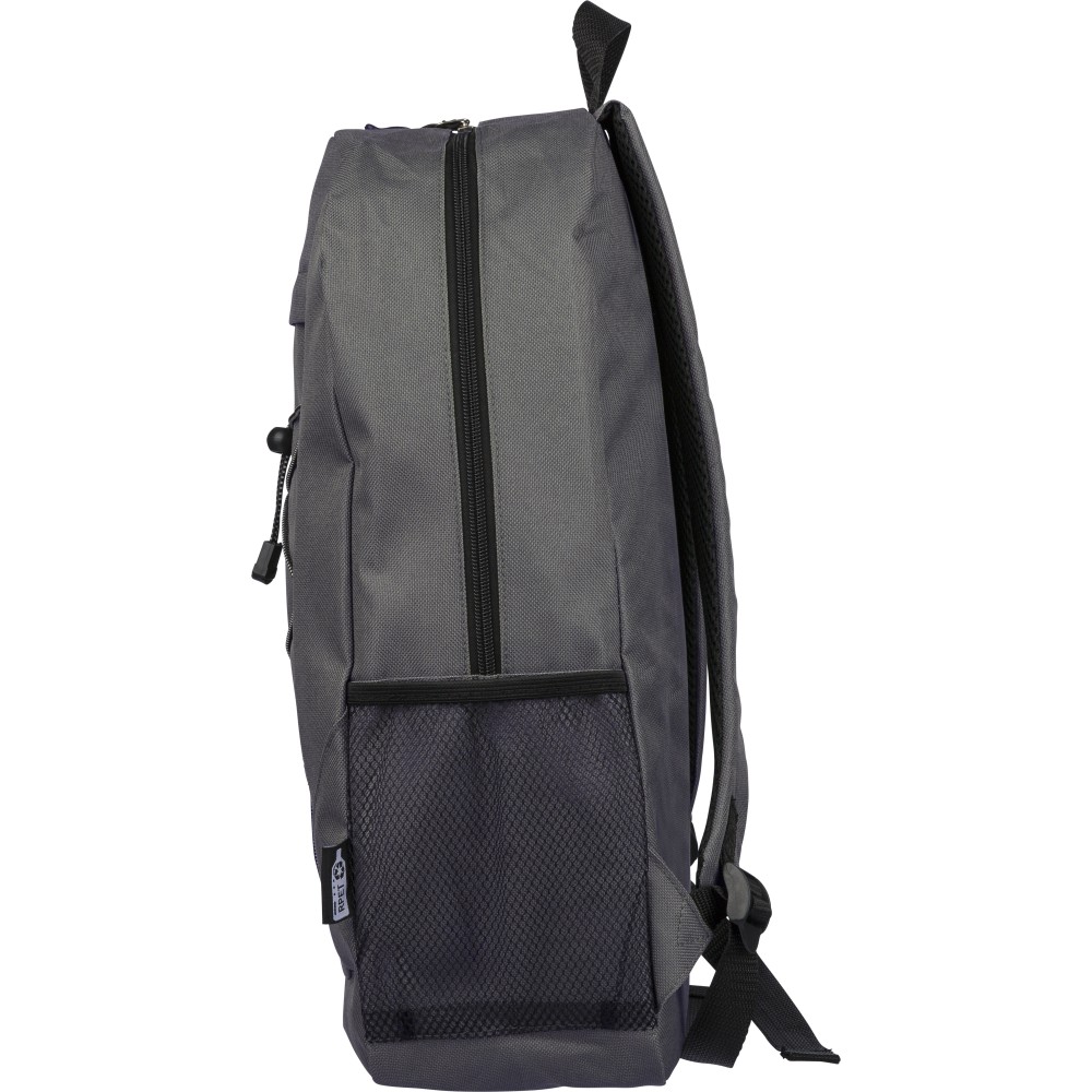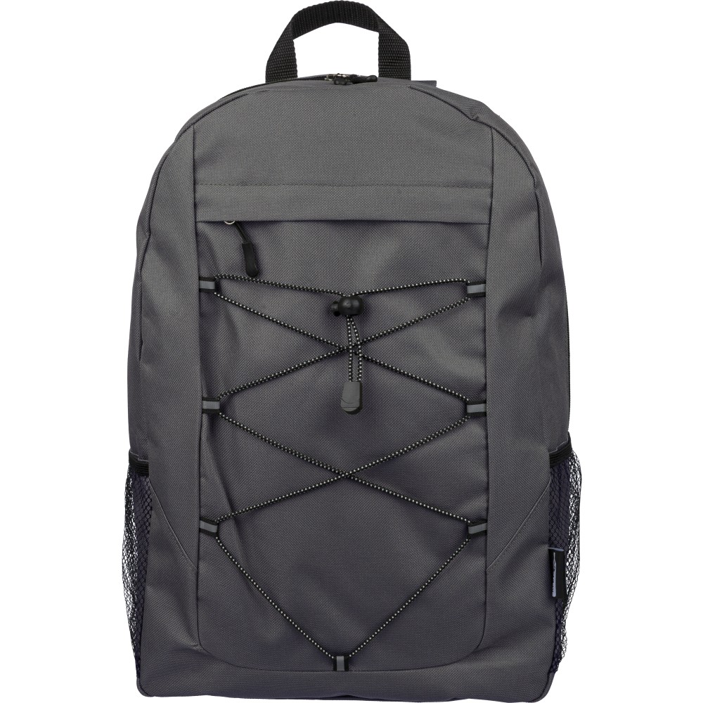 RPET poliészter 600D anyagból készült hátizsák húzózsinóros záródással és nagy cipzáras fő rekesszel. Hálós oldalzsebekkel, rugalmas elülső pántokkal, dekorációhoz kialakított kis elülső cipzáras zsebbel és állítható vállpántokkal rendelkezik. A terméken rPET alapanyagra utaló címke található. Emblémázás: Szitanyomás