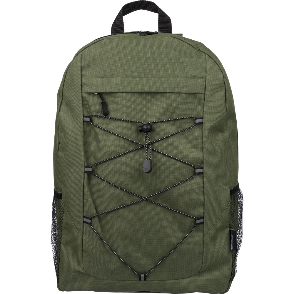 RPET poliészter 600D anyagból készült hátizsák húzózsinóros záródással és nagy cipzáras fő rekesszel. Hálós oldalzsebekkel, rugalmas elülső pántokkal, dekorációhoz kialakított kis elülső cipzáras zsebbel és állítható vállpántokkal rendelkezik. A terméken rPET alapanyagra utaló címke található. Emblémázás: Szitanyomás