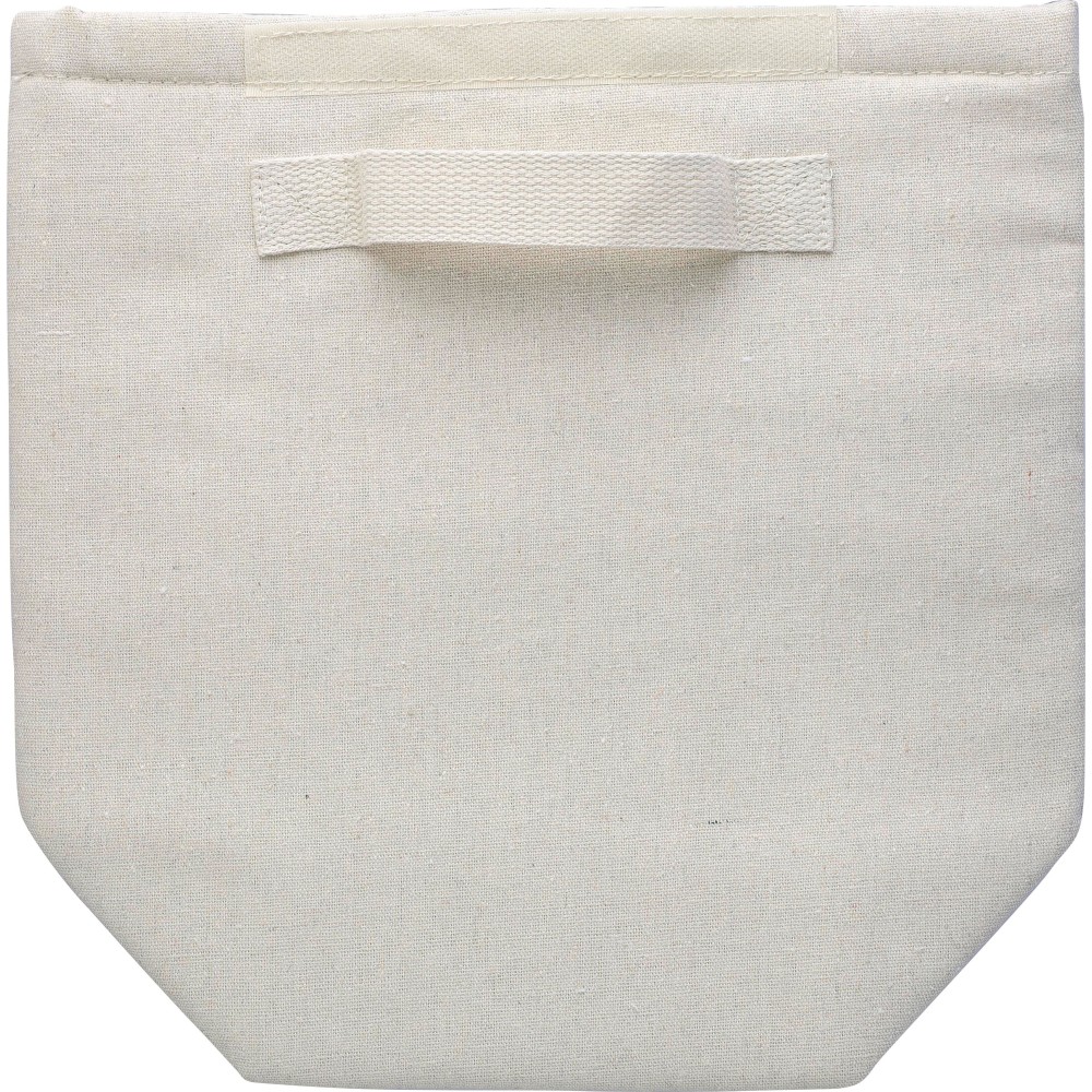 Feltekerhető hűtőtáska, belsejében 3 mm EPE és 12C PEVA béléssel. Tépőzáras záródással, egy kis elülső zsebbel és rövid hordozópánttal a tetején. Az oldalon újrahasznosított pamut anyagra utaló címkével. Újrahasznosított pamut 220 g/m2. Emblémázás: Hímzés