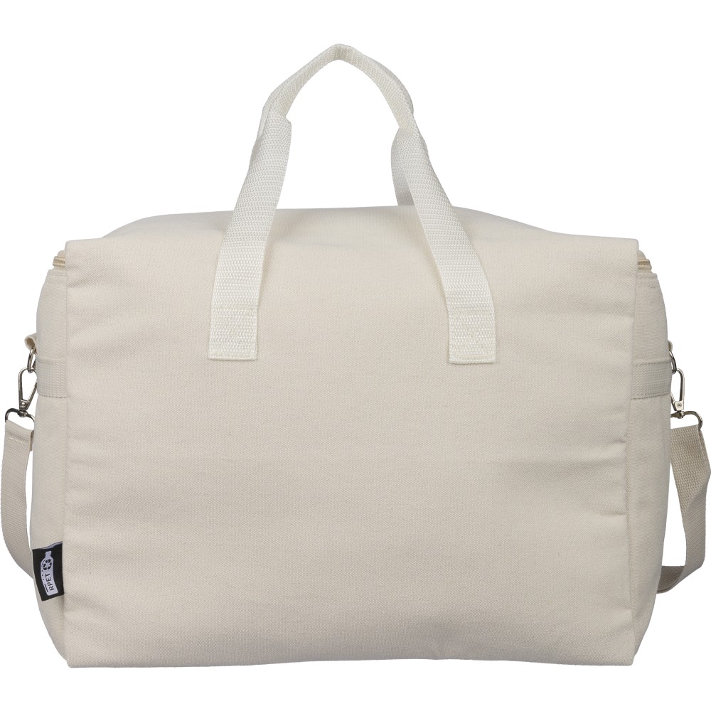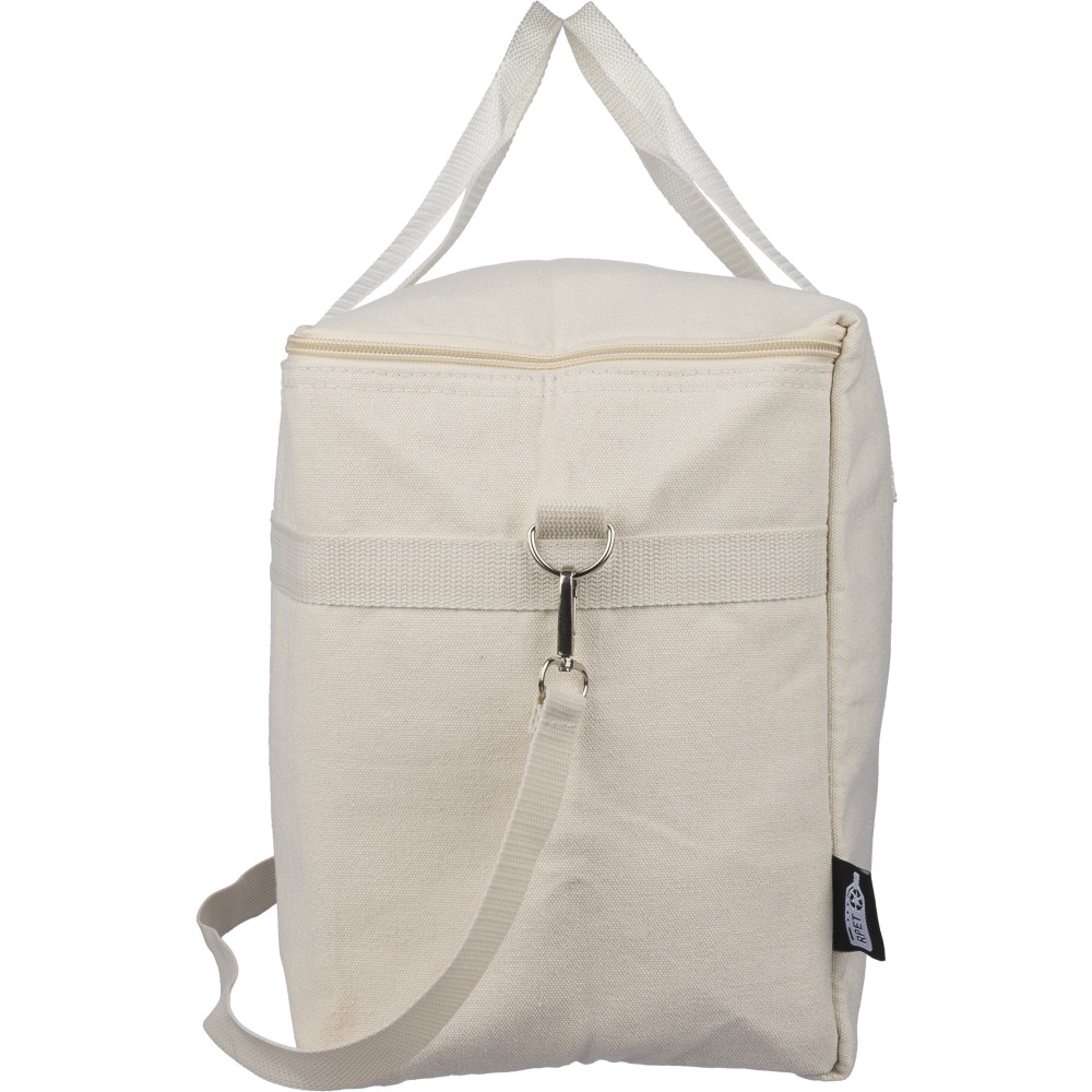 Újrahasznosított pamut-poliészter 330 g/m2 kevertszövetből készült hűtőtáska alumíniumfóliás szigeteléssel, 23 literes űrtartalommal. 60 cm hosszúságú és 3,5 cm szélességű fülekkel, 110 cm hosszúságú és 2,5 cm szélességű állítható vállpánttal, fémcsattal és a táska színével megegyező hevederrel rendelkezik. Külső felületén rPET címkével, belső részében további címkével ellátva. Emblémázás: Szitanyomás