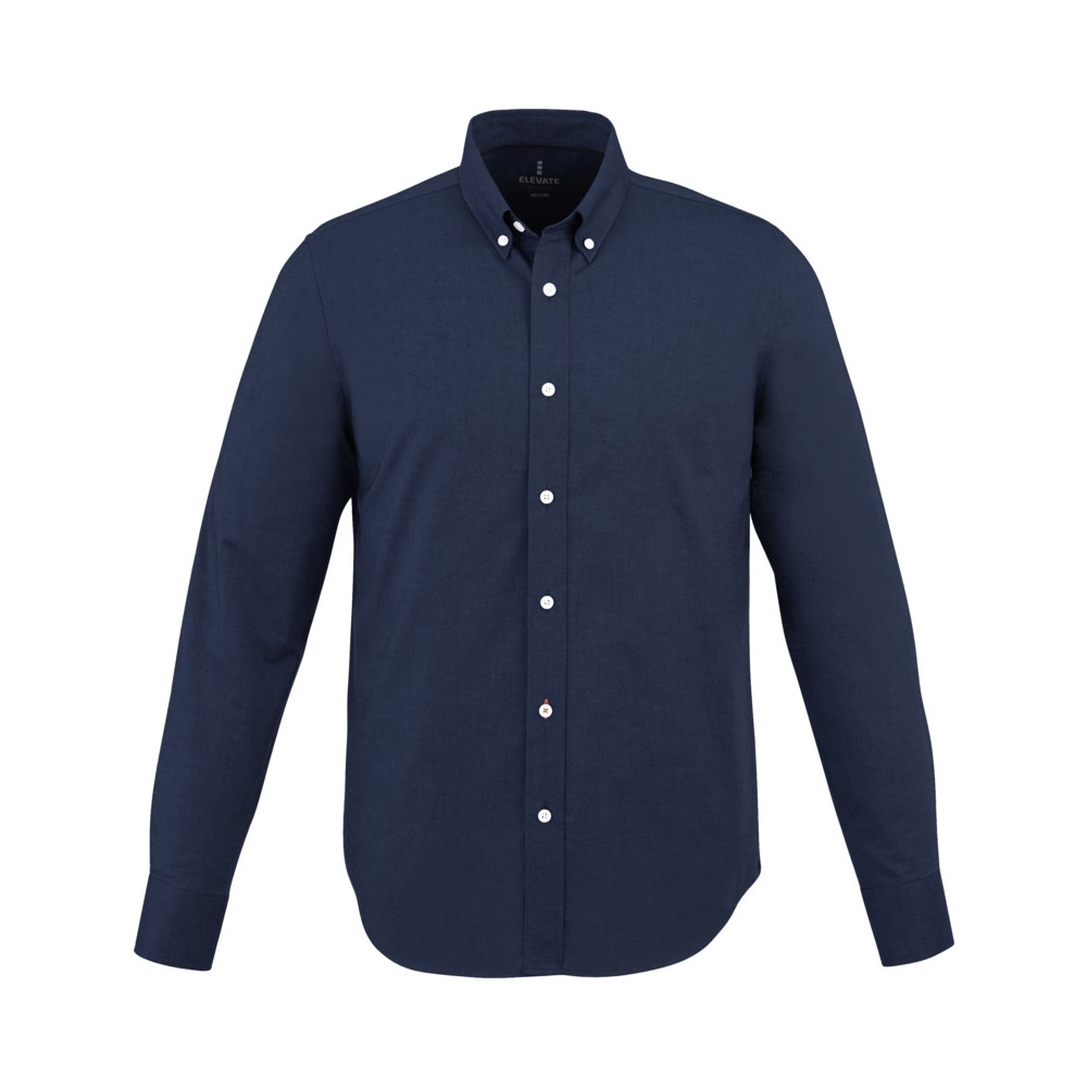 Normál szabásvonal. Elevate logóval gravírozott, fehér gombok. Alulról a második gomblyuk narancssárga öltésekkel dekorálva. Két gombos, állítható kézelő gombolás. Tónusos logónyomat hátul. Szatén szegély a nyakvonalban. Legombolható gallér (férfi). 100% pamut Oxford anyag. Emblémázás: Hímzés