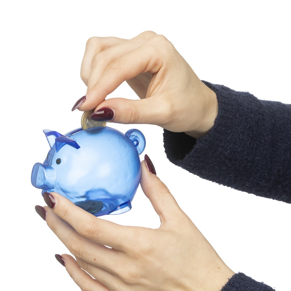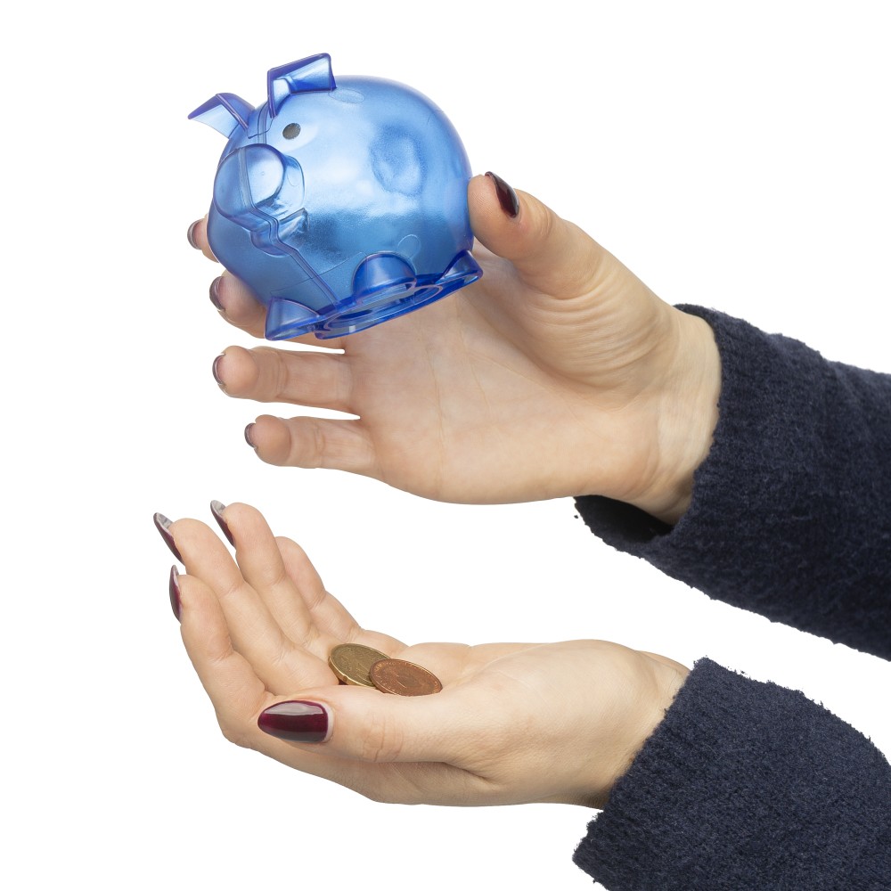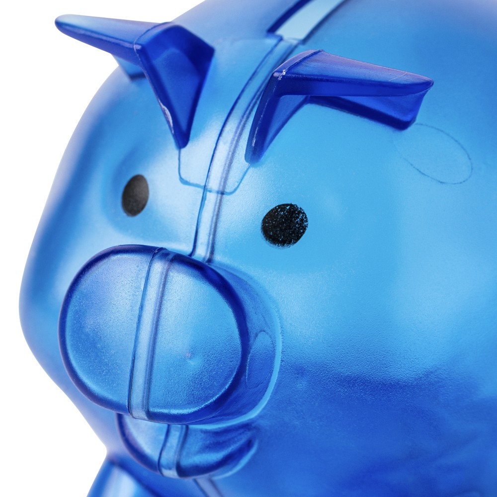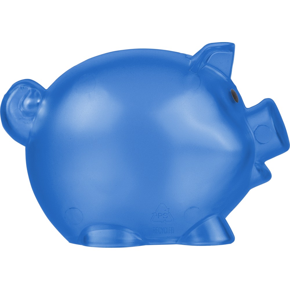 Újrahasznosított PS műanyagból készült, malacpersely. A hátoldalon recycled (újrahasznosított) alapanyagra utaló logó található. Emblémázás: Tamponnyomás