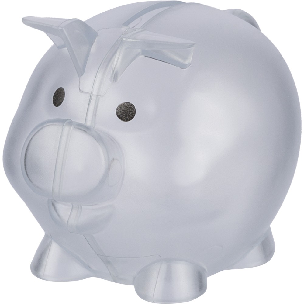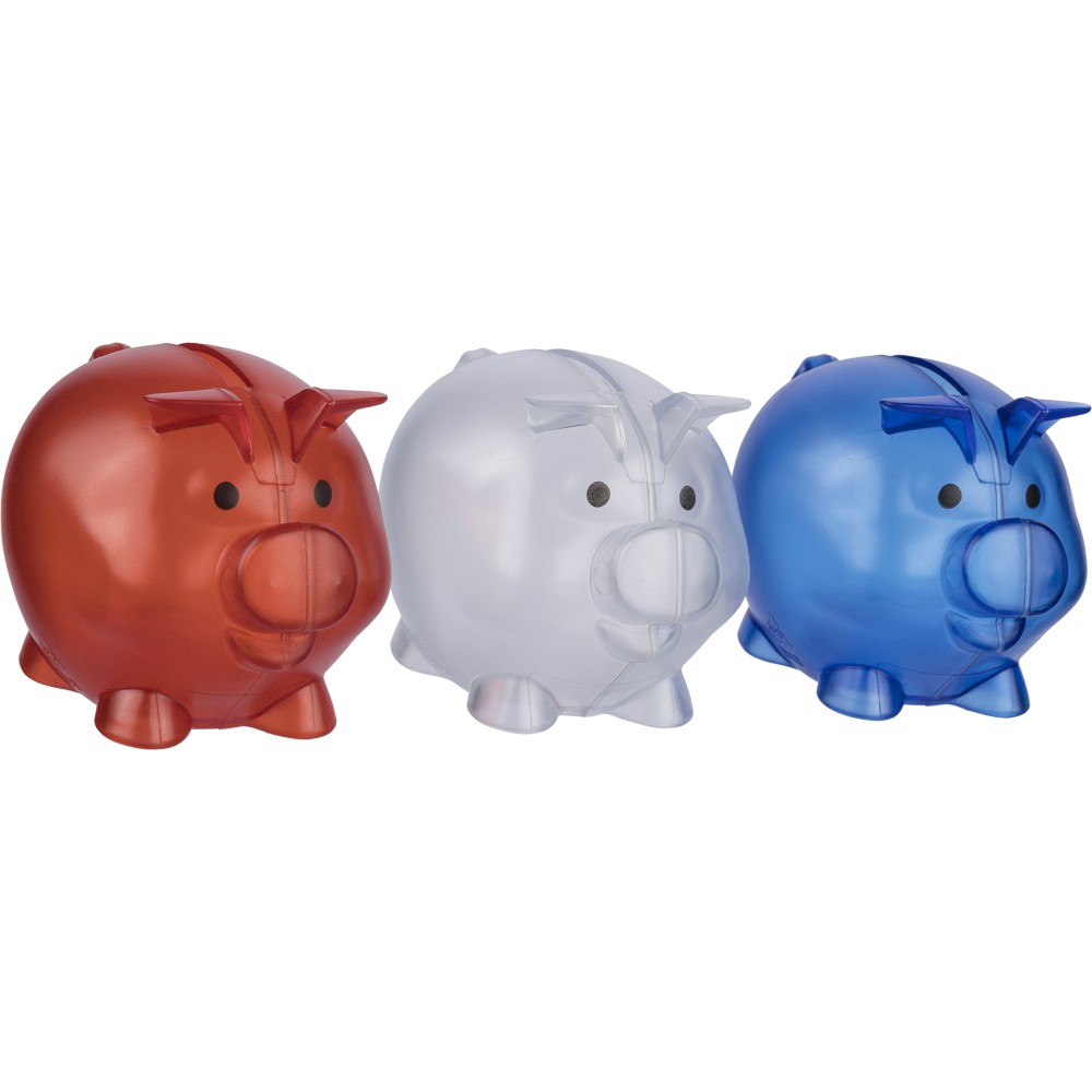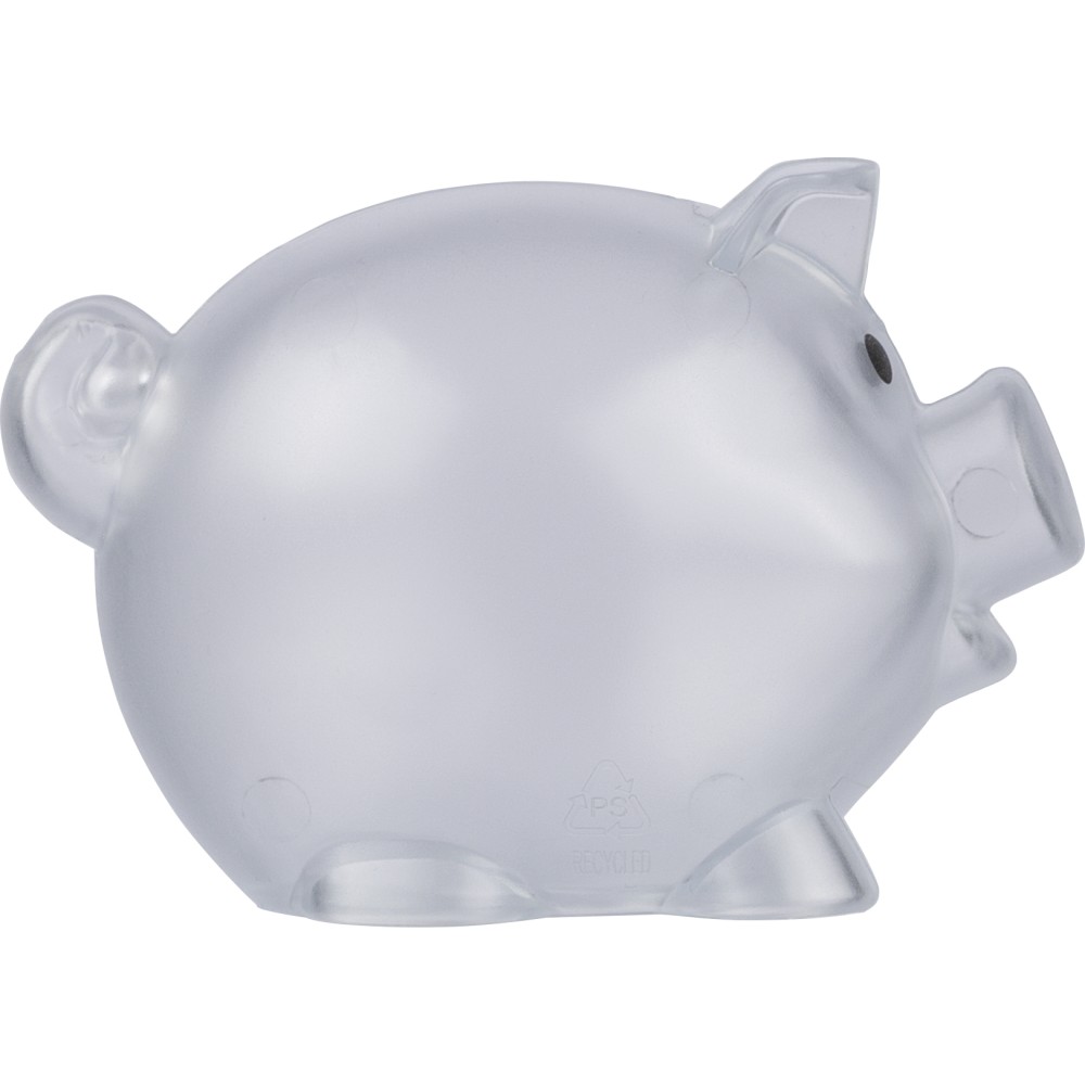 Újrahasznosított PS műanyagból készült, malacpersely. A hátoldalon recycled (újrahasznosított) alapanyagra utaló logó található. Emblémázás: Tamponnyomás