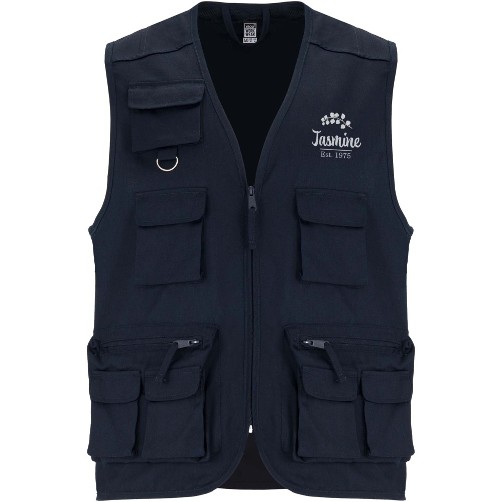 V-nyakú, többfunkciós zsebekkel ellátott munkamellény. Elülső cipzárja húzókával felszerelt. A mellrészen három zseb található, amelyek hajtókával és tépőzárral záródnak, a felső zseb pedig multifunkciós gyűrűvel kiegészített. Két cipzáras és húzókával ellátott oldalsó zsebbel rendelkezik, amelyeken két további, hajtókás és tépőzáras zseb helyezkedik el. A hátoldalon két hajtókás, tépőzáras zseb található. A nyakkivágás, a karkivágások és az derékrész díszítőszegéllyel van ellátva.