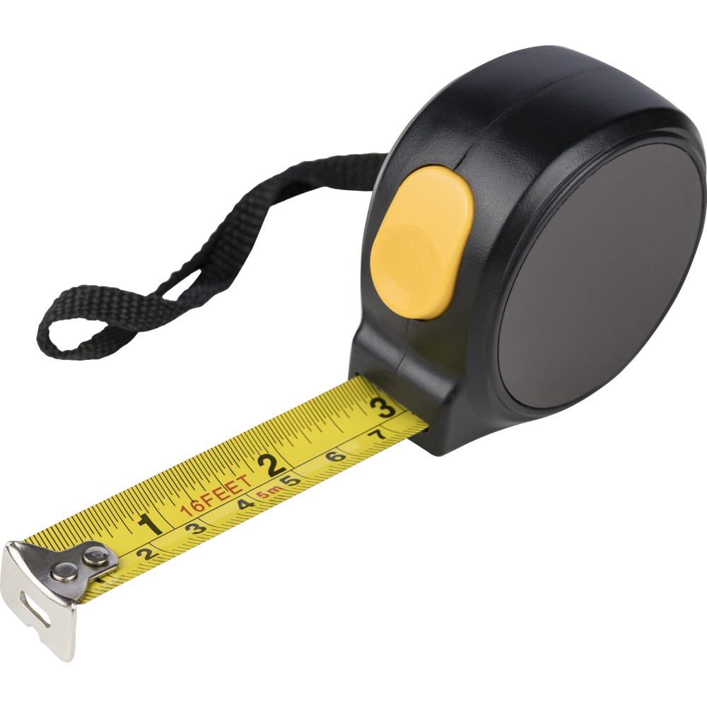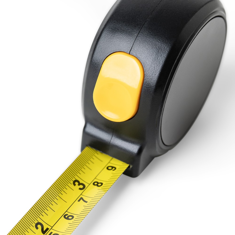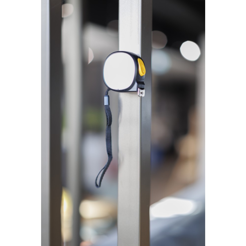 ABS műanyagból készült mérőszalag mágneses oldallal, 5 m hosszúságú és 19 mm szélességű fém szalaggal, centiméter- és inch-beosztással. Felül elhelyezett nyomógomb a rögzítéshez/kioldáshoz, valamint poliészter csuklópánt. Egyenként csomagolva illusztrációval ellátott barna kartondobozban. Emblémázás: Tamponnyomás
