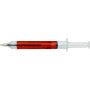 Színes folyadékkal töltött fecskendő alakú golyóstoll. Újrahasznosított ABS-ből készült, nyomógombos szerkezetű, fekete tollbetéttel szállítjuk. Érintőképernyőkhöz használható stylus véggel rendelkezik. In-mould (öntőformában elhelyezett) újrahasznosított ABS logóval díszítve.
