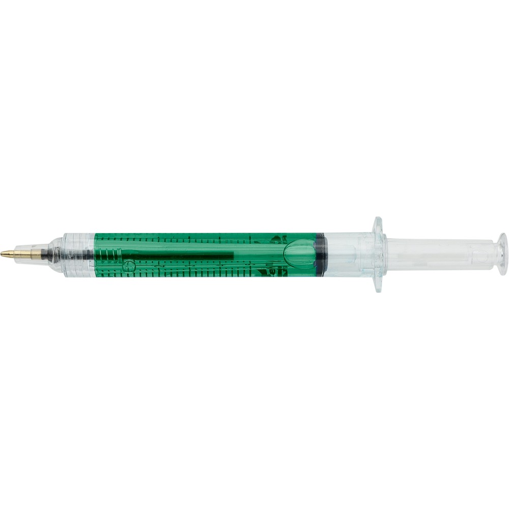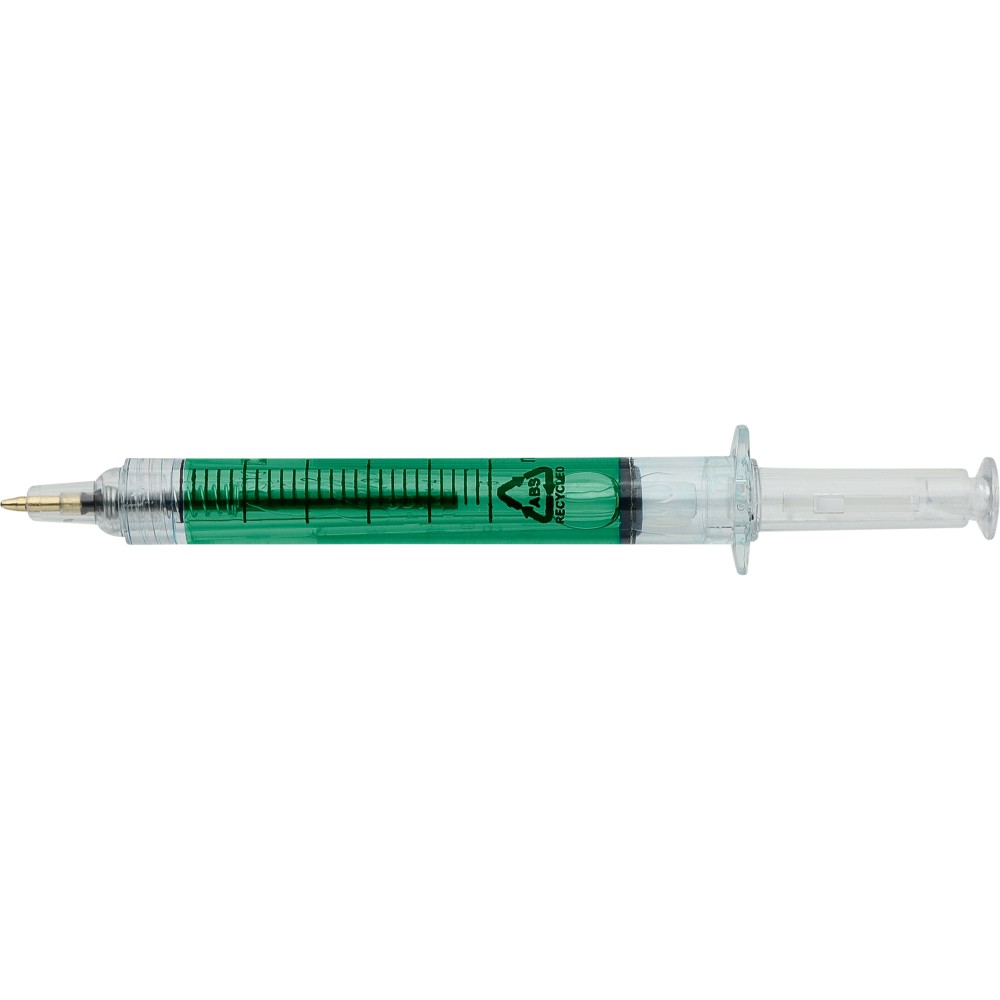 Színes folyadékkal töltött fecskendő alakú golyóstoll. Újrahasznosított ABS-ből készült, nyomógombos szerkezetű, fekete tollbetéttel szállítjuk. Érintőképernyőkhöz használható stylus véggel rendelkezik. In-mould (öntőformában elhelyezett) újrahasznosított ABS logóval díszítve.