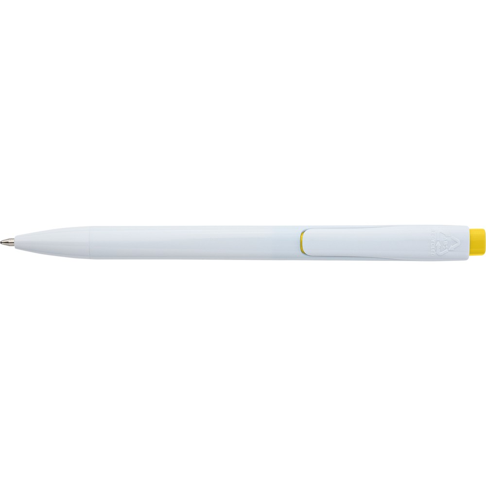 Golyóstoll tömör fehér tolltesttel és színes nyomógombbal. Újrahasznosított ABS-ből készült. Nyomógombos szerkezettel, klipsszel, valamint a nyomógomb tetején újrahasznosított ABS logóval rendelkezik. Kék színű, német Dokumental tollbetéttel, mely körülbelül 800 méter íráshosszt biztosít.