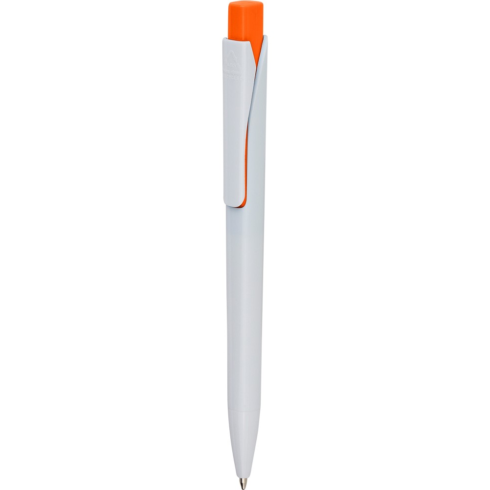 Golyóstoll tömör fehér tolltesttel és színes nyomógombbal. Újrahasznosított ABS-ből készült. Nyomógombos szerkezettel, klipsszel, valamint a nyomógomb tetején újrahasznosított ABS logóval rendelkezik. Kék színű, német Dokumental tollbetéttel, mely körülbelül 800 méter íráshosszt biztosít.