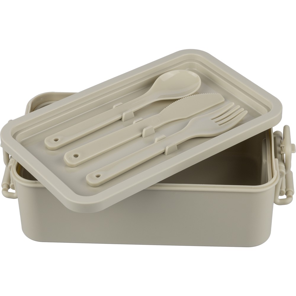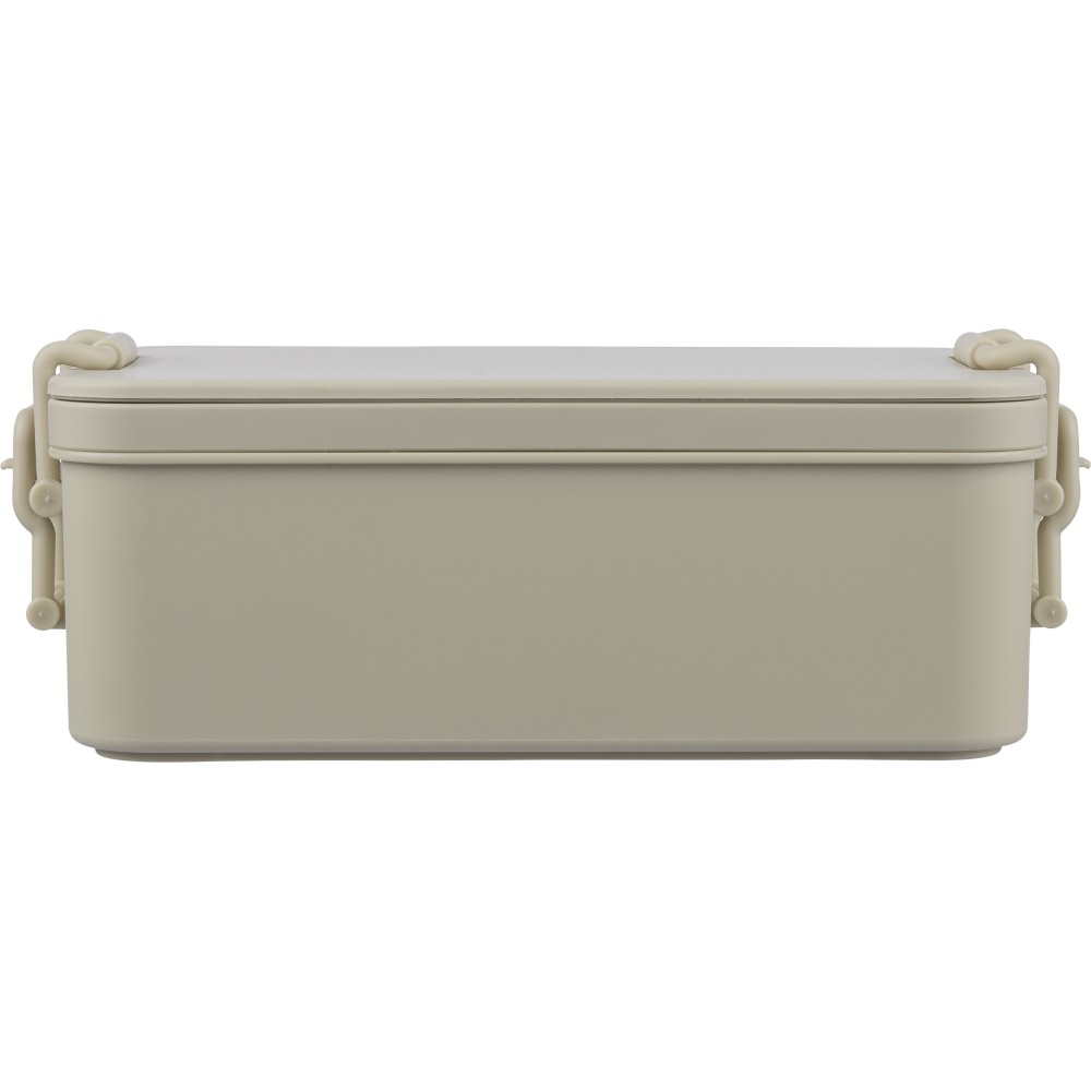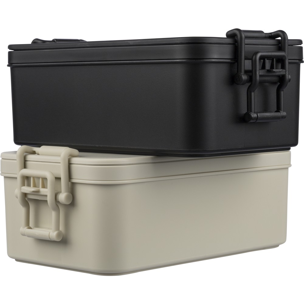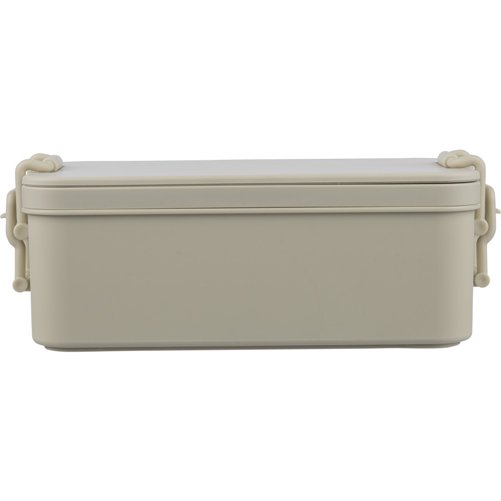 PP anyagból készült, két szintes ételtároló doboz csatos záródással és PP fedéllel. A kisebb alsó rekesz a helytakarékosság érdekében a felsőbe illeszthető. Köztes réteggel rendelkezik, amely háromrészes evőeszközkészletet tartalmaz. Űrtartalma 2 200 ml. Nincs egyenként csomagolva. Emblémázás: Tamponnyomás,