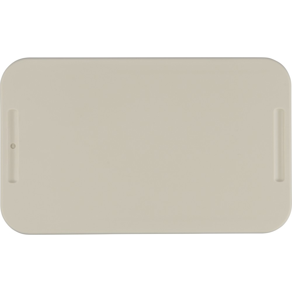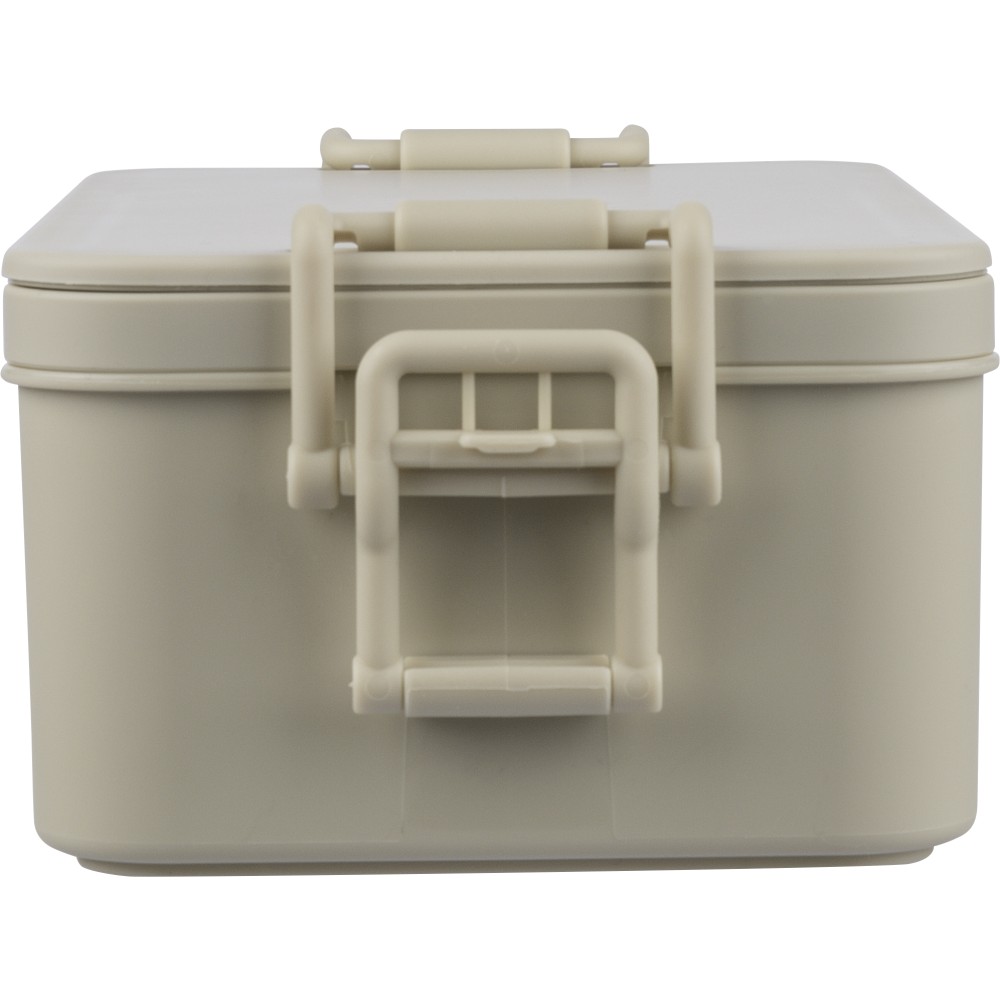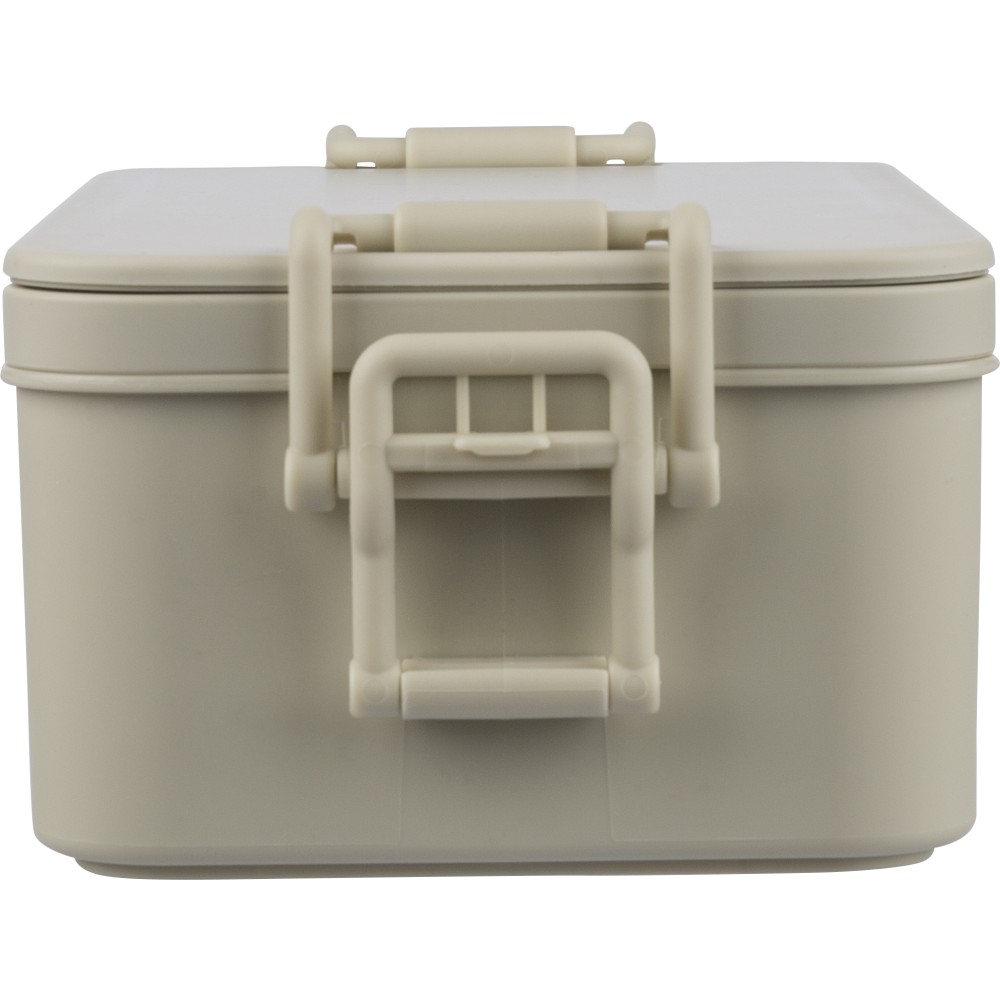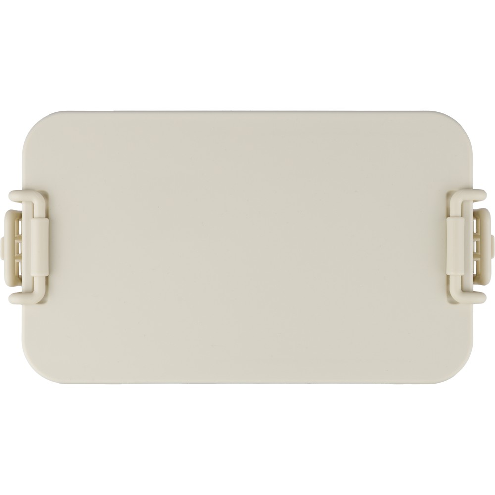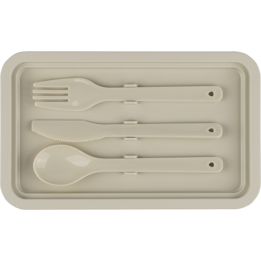 PP anyagból készült, két szintes ételtároló doboz csatos záródással és PP fedéllel. A kisebb alsó rekesz a helytakarékosság érdekében a felsőbe illeszthető. Köztes réteggel rendelkezik, amely háromrészes evőeszközkészletet tartalmaz. Űrtartalma 2 200 ml. Nincs egyenként csomagolva. Emblémázás: Tamponnyomás,