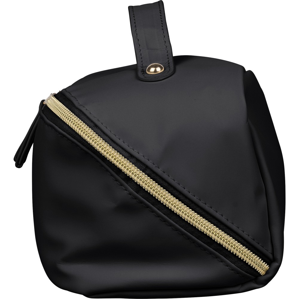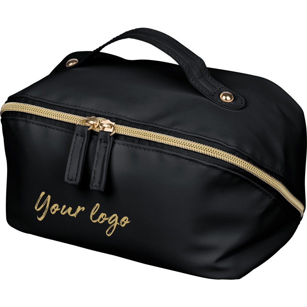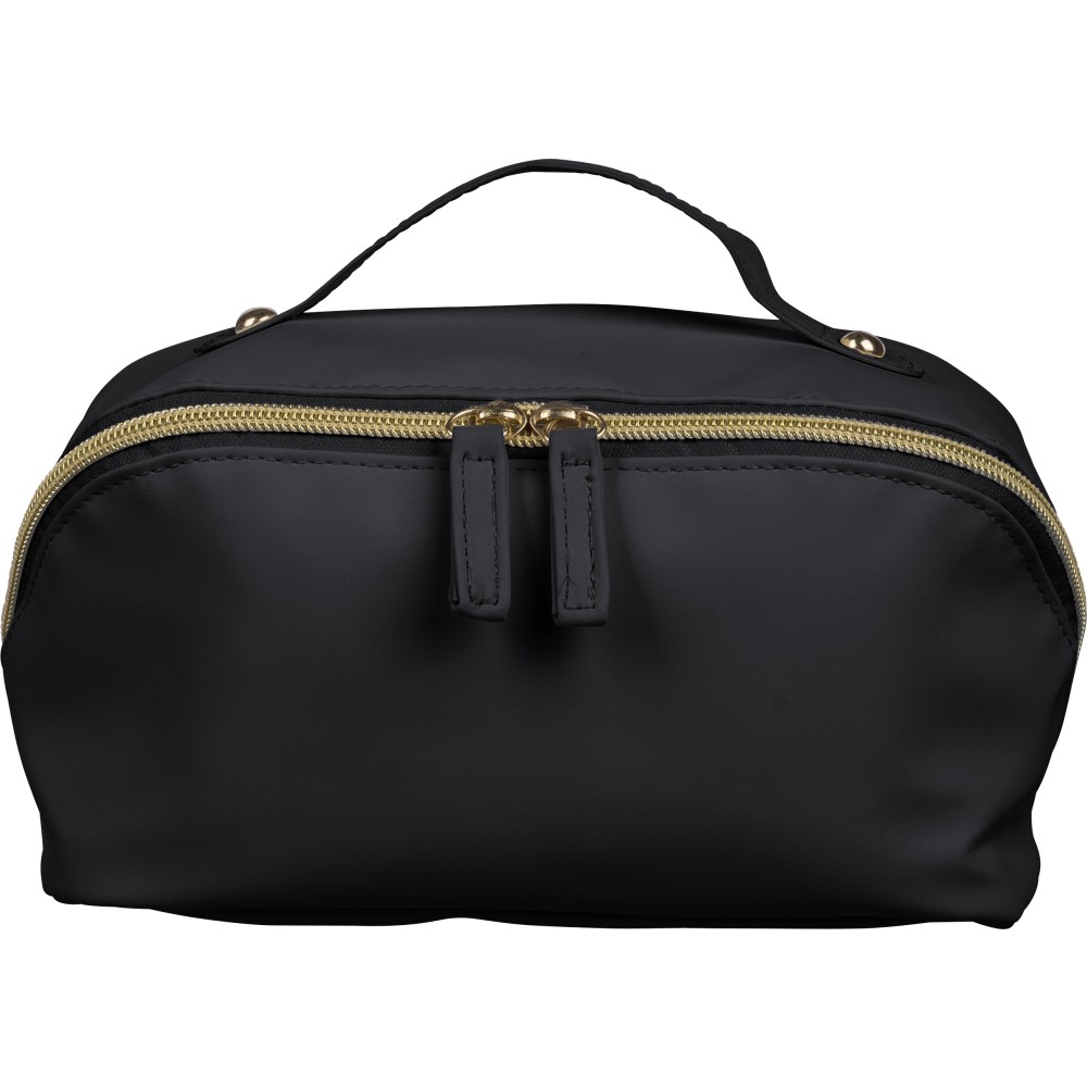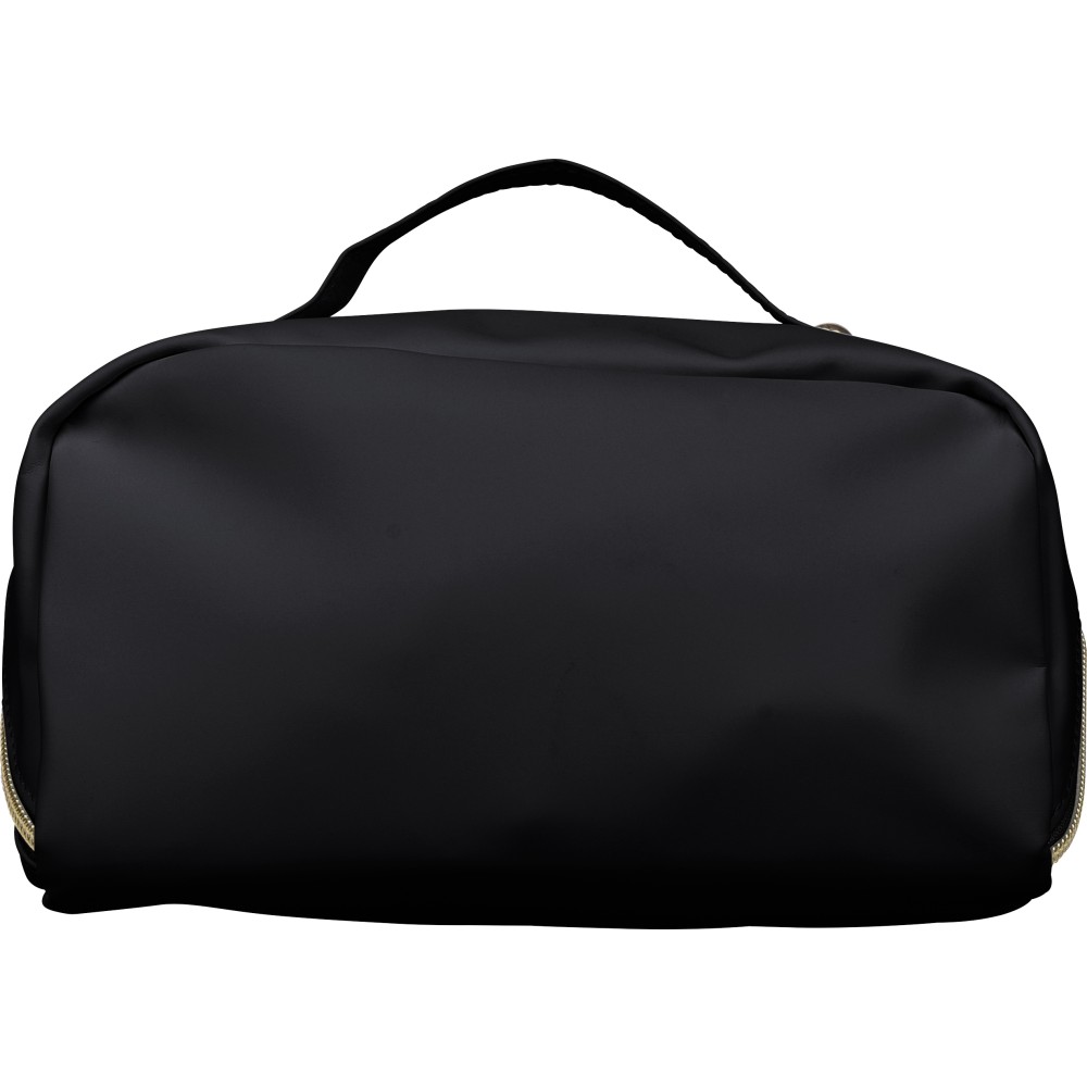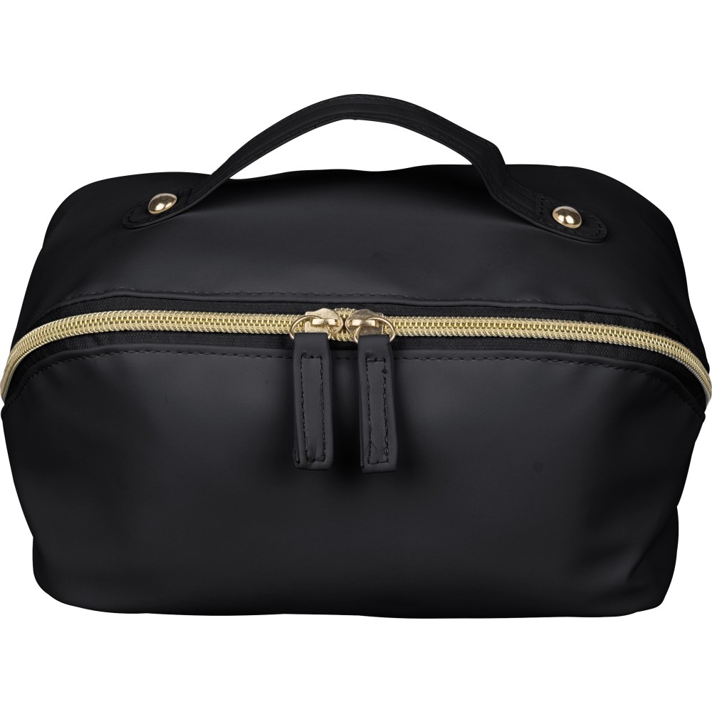 Újrahasznosított PU anyagból készült neszesszer középen elhelyezett cipzárral a széles nyithatóság érdekében. Rövid fogantyúval, tágas belső térrel és négy rekesszel, beleértve egy belső cipzáras zsebet. 210D újrahasznosított béléssel készült, belsejében egy újrahasznosított alapanyagra utaló címkével. Emblémázás: Szitanyomás