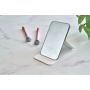 Üvegtükör összehajtható, újrahasznosított PU borítással, amely kinyitva álló helyzetben használható. A borításon dombornyomott, újrahasznosított alapanyagra utaló logó található. Papírtasakba csomagolva. Emblémázás: Tamponnyomás,