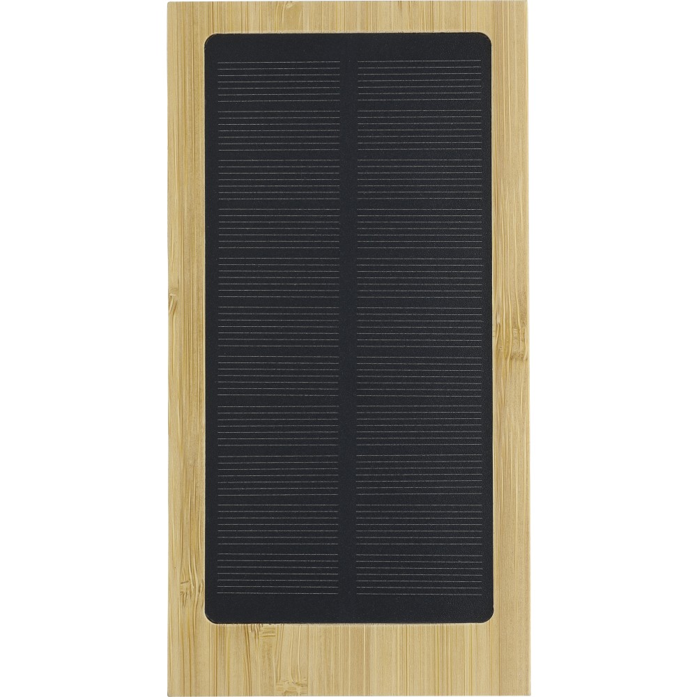 Bambusz napelemes powerbank 10.000 mAh kapacitással, dual USB-A és USB-C porttal, vezeték nélküli töltés funkcióval, beépített napelemes panellel és 5 db LED jelzőfénnyel. 30 cm-es fehér kábel tartozik hozzá. Csomagolása barna papírdoboz. Emblémázás: Gravírozás, Tamponnyomás, UV nyomtatás