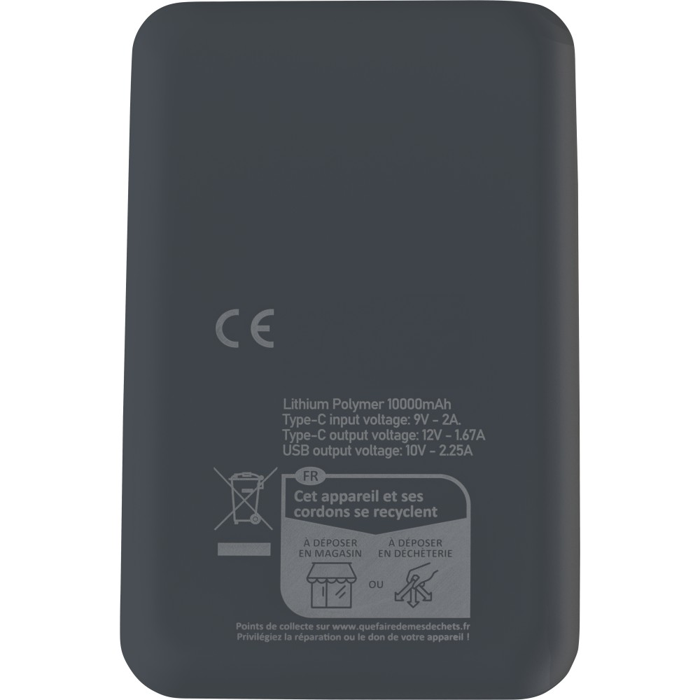 Újrahasznosított ABS anyagból készült powerbank 10 000 mAh kapacitással és 22,5 W gyors töltési teljesítménnyel. Type-C in/out és Type-A bemenettel, digitális kijelzővel, sima és texturált felülettel. Biztonsági védelmekkel ellátva. A hátoldalon gravírozott recycled (újrahasznosított) alapanyagra utaló logó található. Selyempapírral bélelt barna dobozba csomagolva. Emblémázás: UV nyomtatás