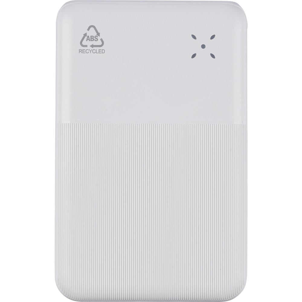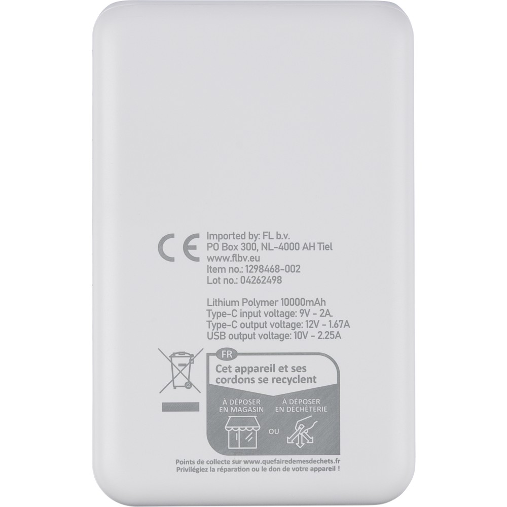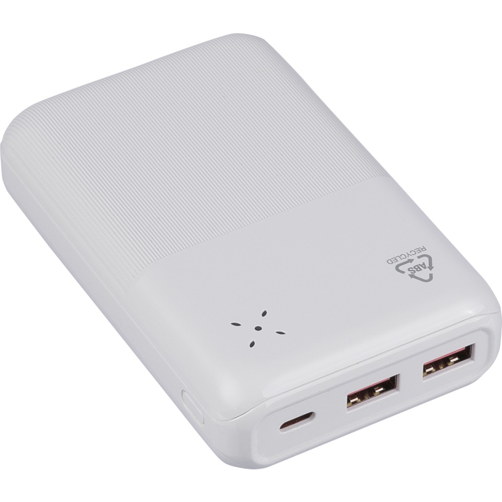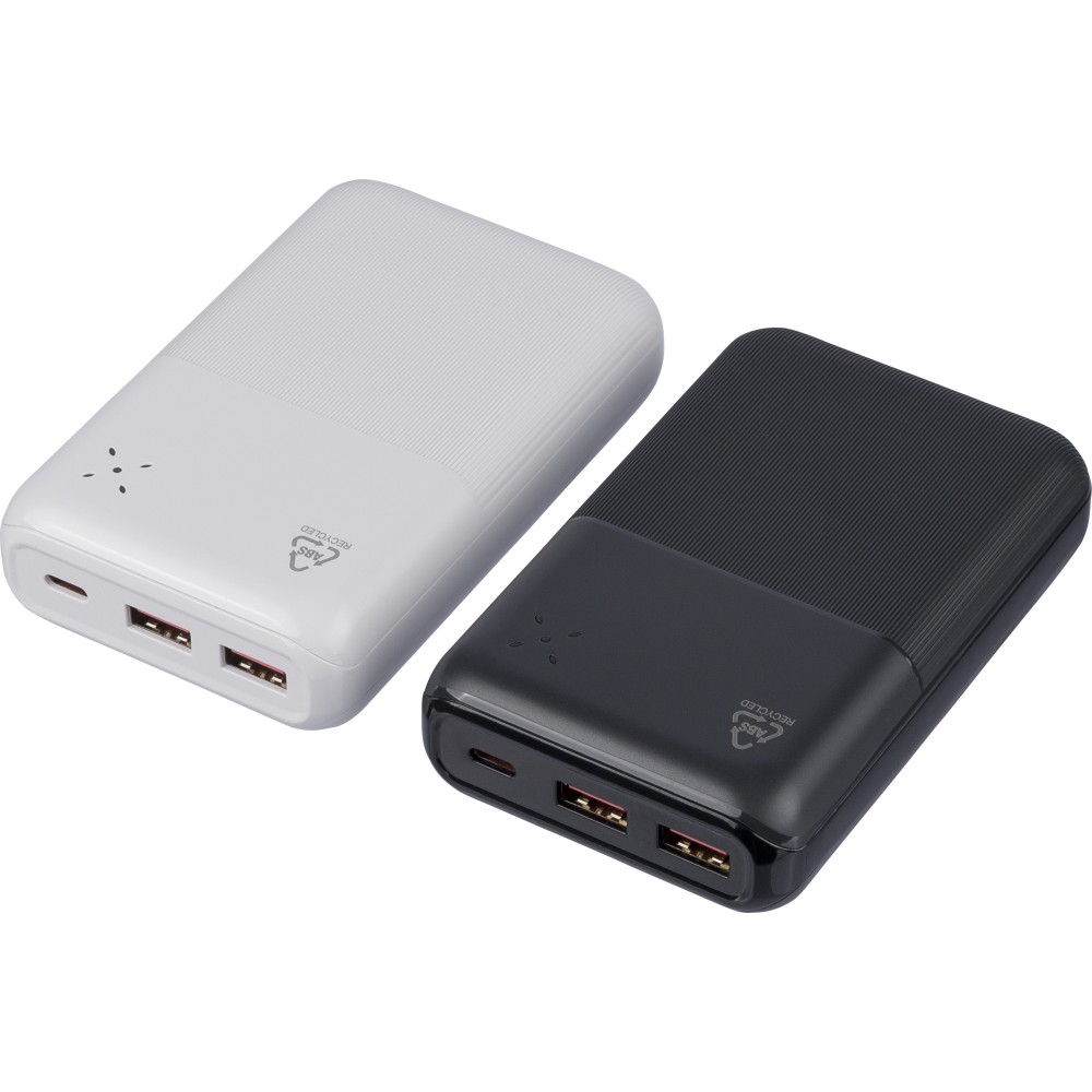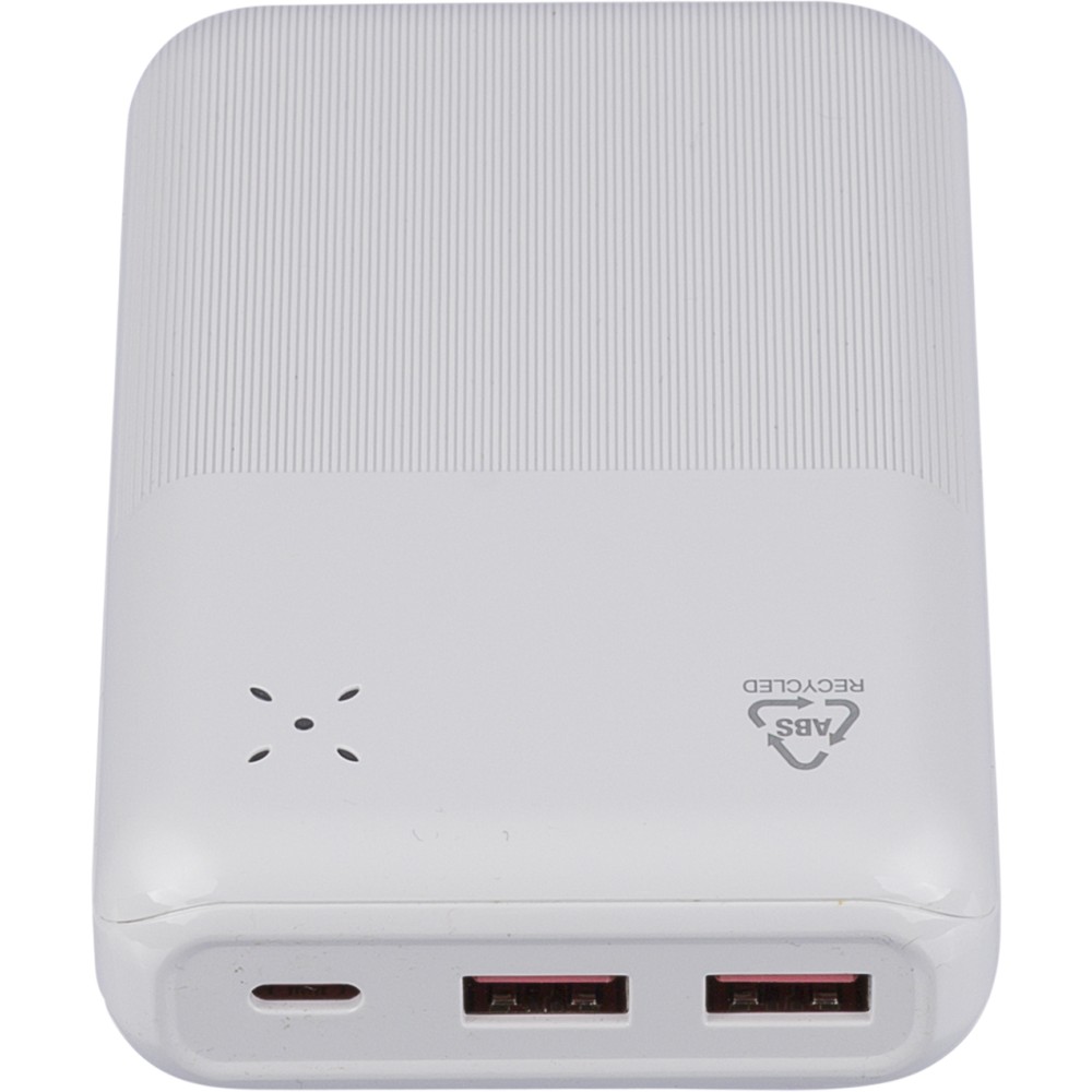Újrahasznosított ABS anyagból készült powerbank 20 000 mAh kapacitással és 22,5 W gyors töltési teljesítménnyel. Type-C in/out és Type-A bemenettel, LED visszajelzővel és biztonsági védelmekkel. A hátoldalon gravírozott recycled (újrahasznosított) alapanyagra utaló logó található. Selyempapírral bélelt barna dobozba csomagolva. Emblémázás: UV nyomtatás