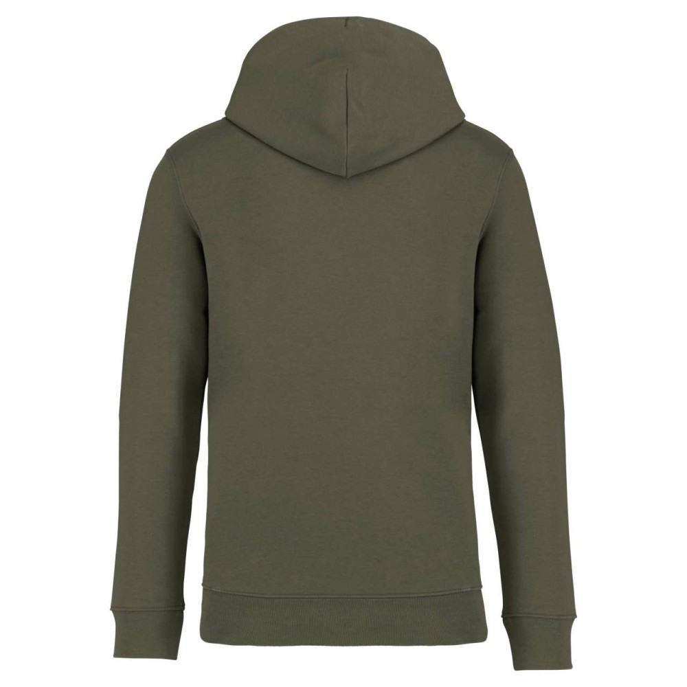 85 % bio, fésült pamutból és 15 % újrahasznosított poliészterből készült. Unisex. Egyenes szabás. Méretcímke organikus pamut és újrahasznosított poliészter logóval. LSF (Low Shrinkage Fleece: előzsugorított polár) kezelés. Kapucni. 1x1 bordás szegély és kézelő. Duplatűzés a kézelőn, a szegélyen és a nyaknál. Szalagozott nyakbelső hátul. Bélelt kapucni, a nyaknyíláson nincs felülvarrás, csak egy megkötés, hogy a húzózsinór a felső részen maradjon. Kerek húzózsinór a kapucnin fém véggel. Kenguru zseb. Nincs márkajelzés a nyakrészen, csak egy méretcímke a könnyű dekorálás érdekében. Karton függőcímkével érkezik, amely felsorolja a termék előállításához felhasznált környezetbarát anyagokat. Organikus pamutfonal. OEKO-TEX N CQ1007/7 STANDARD 100 tanúsítvánnyal rendelkezik. IFTH. 350 g/m2. Emblémázás: Hímzés, Szitanyomás