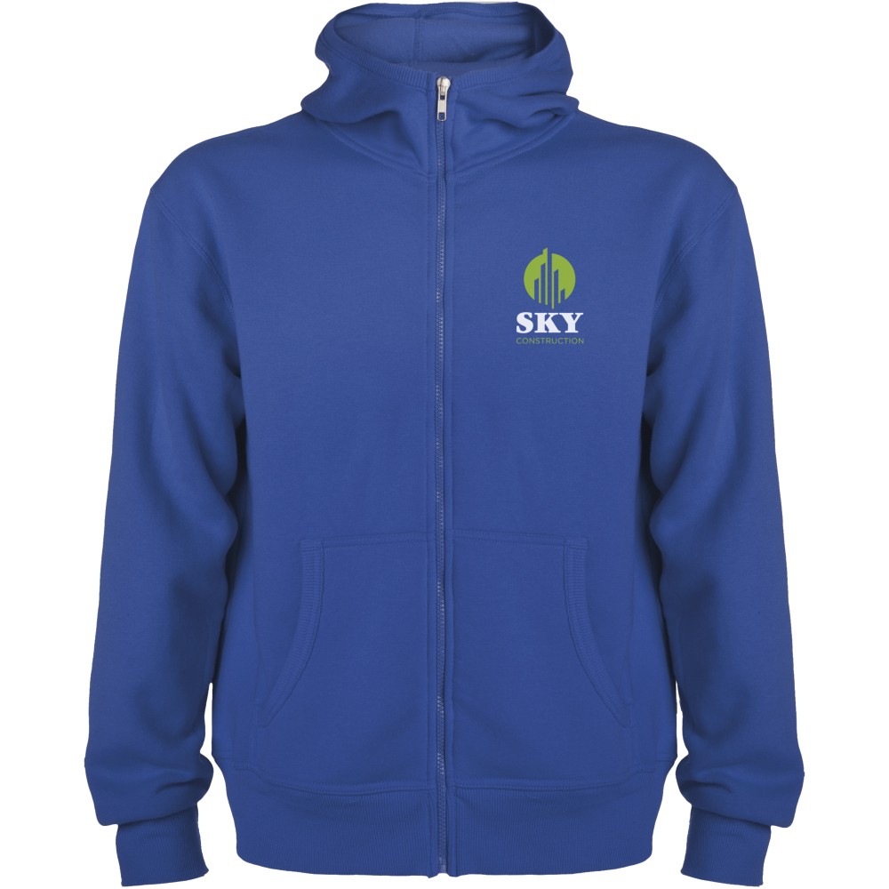 Magasnyakú, kapucnis pulóver teljes cipzárral. Bordázott részletek a kapucni és a zsebek szélén. Kenguru stílusú zseb. 2x2-es bordás kézelő és nyakpasszé. Gyerekméretekben is kapható. 50% pamut és 50% poliészter, 280 g/m2. Emblémázás: Hímzés, Szitanyomás