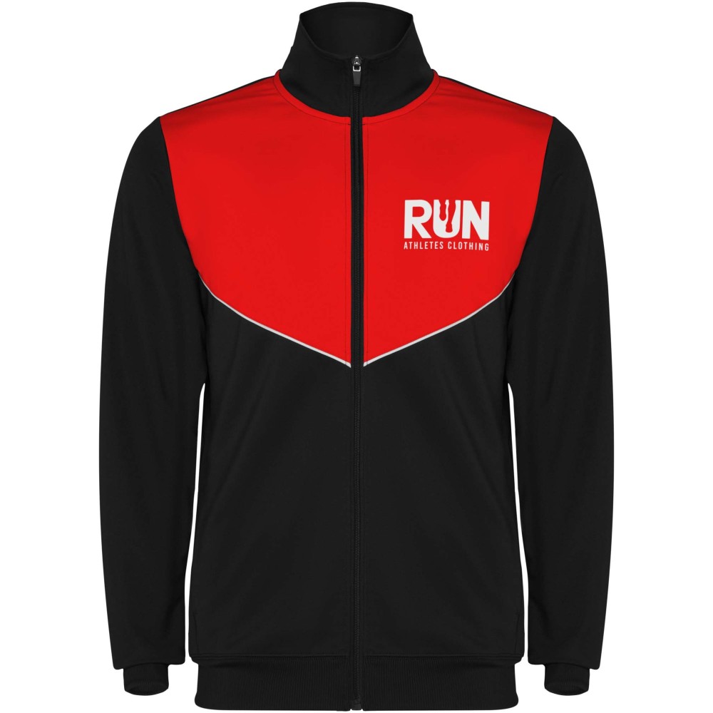 Könnyű és rugalmas anyagból készült melegítő. A végig cipzáros felső kontrasztos színű és varrású díszítésekkel dekorált a mellrészen. Oldalzsebek. Bordázott ujj- és és derékpasszé. Nadrág gumis derékkal és húzózsinórral, kontrasztos oldalsó varrással. Cipzáras szegély. Emblémázás: Hímzés, Szitanyomás