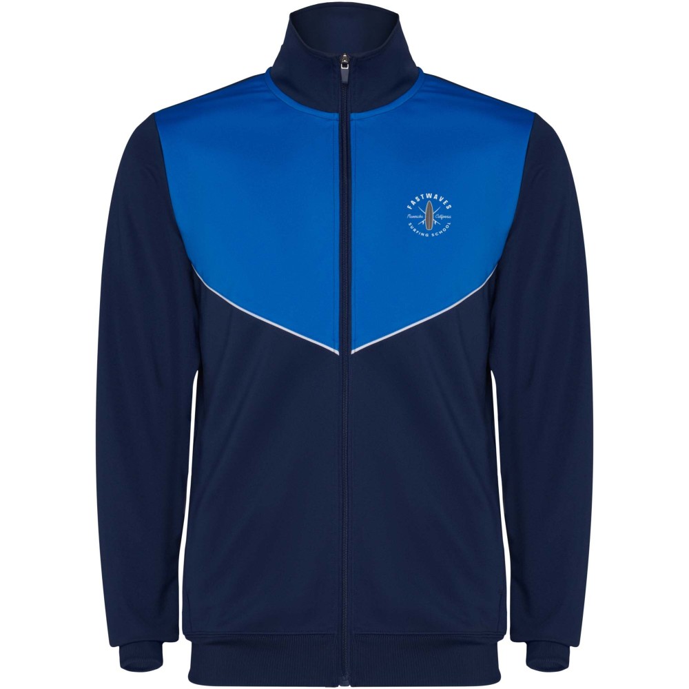 Könnyű és rugalmas anyagból készült melegítő. A végig cipzáros felső kontrasztos színű és varrású díszítésekkel dekorált a mellrészen. Oldalzsebek. Bordázott ujj- és és derékpasszé. Nadrág gumis derékkal és húzózsinórral, kontrasztos oldalsó varrással. Cipzáras szegély. Emblémázás: Hímzés, Szitanyomás
