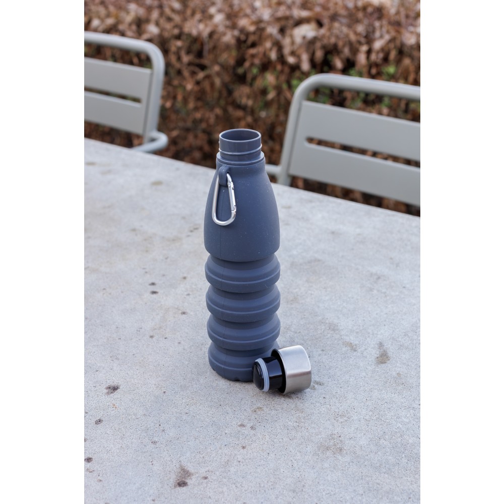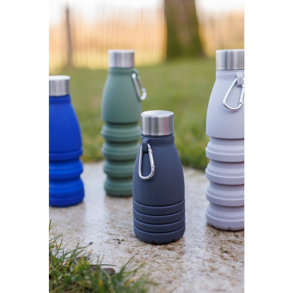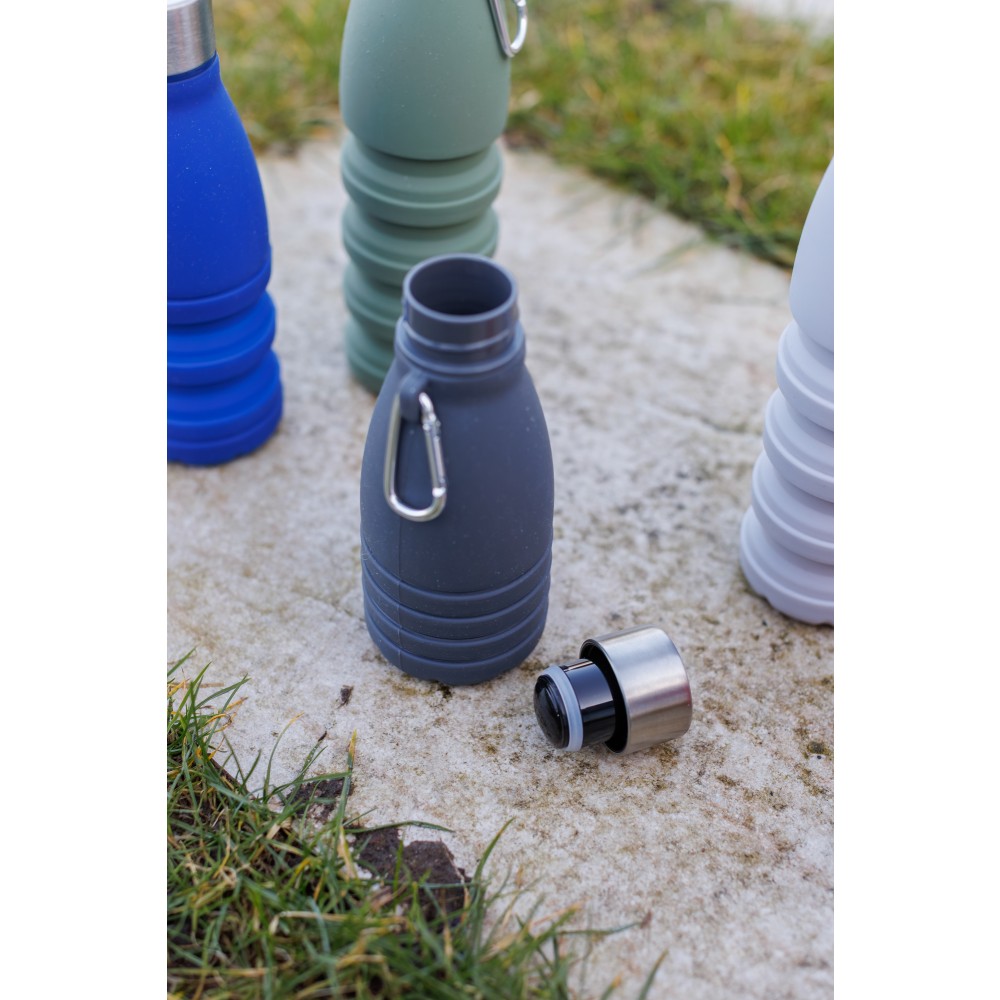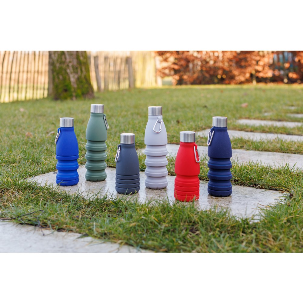 Összecsukható palack rozsdamentes acél fedéllel és alumínium karabinerrel. Összecsukott méret: d: 7x17 cm, kinyitott méret: d: 7x25 cm. Nincs egyenként csomagolva. Anyaga: szilikon. Űrtartalom: 550 ml. Emblémázás: Gravírozás
