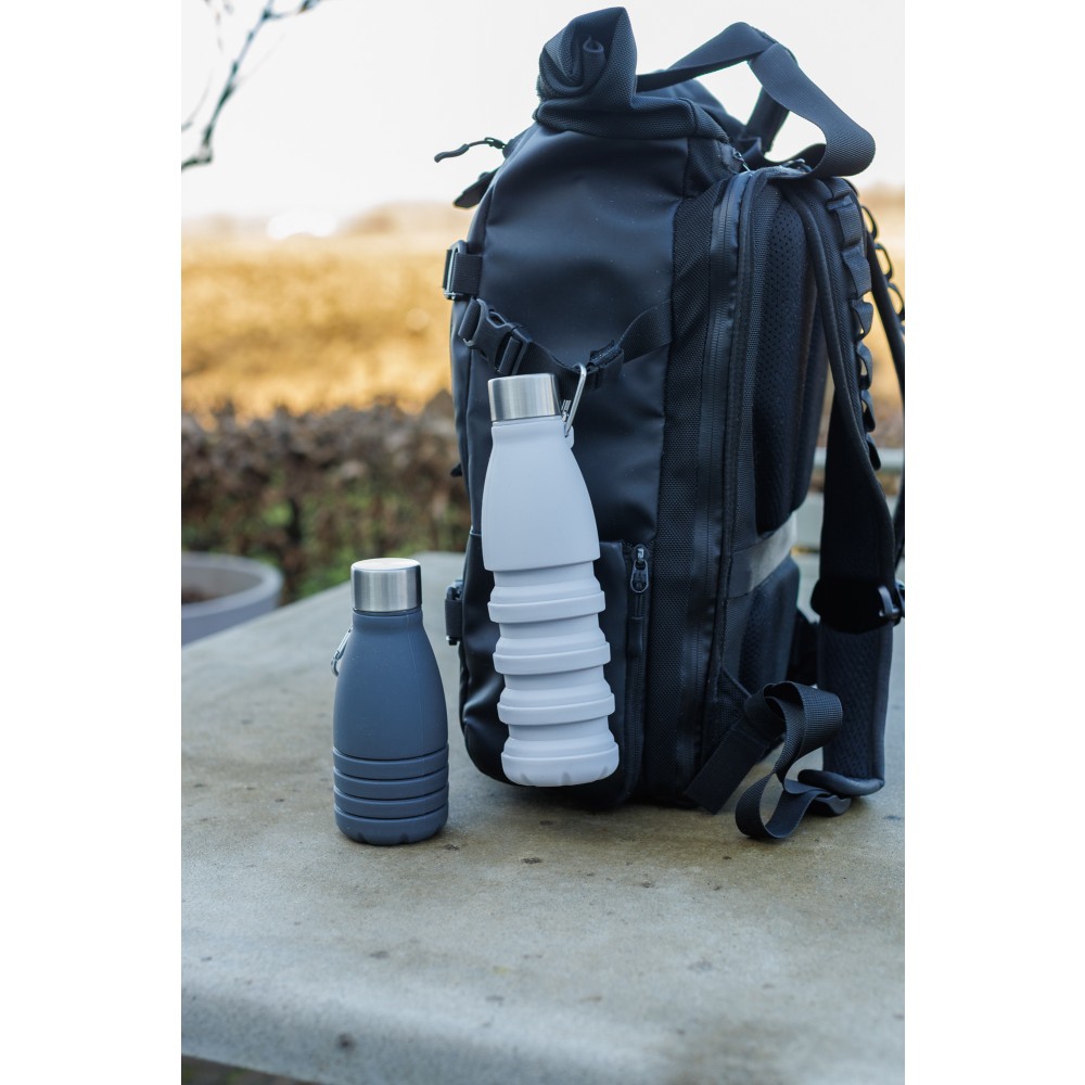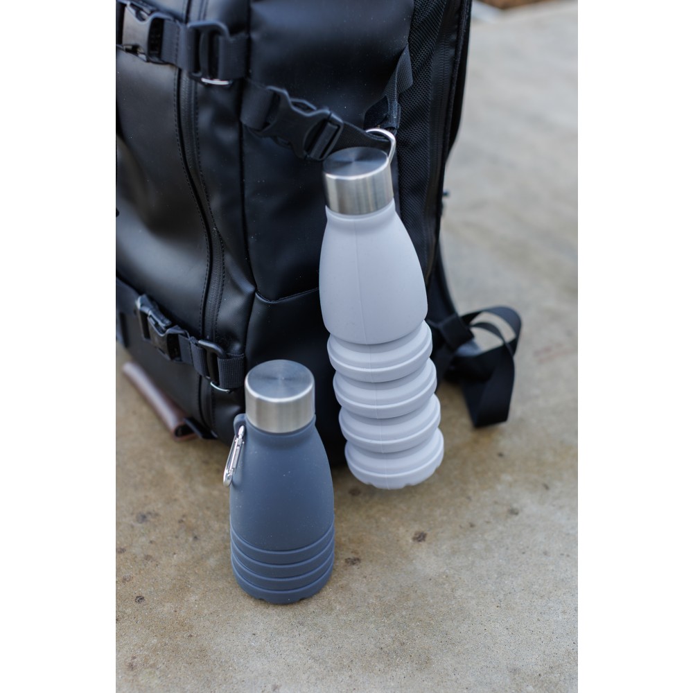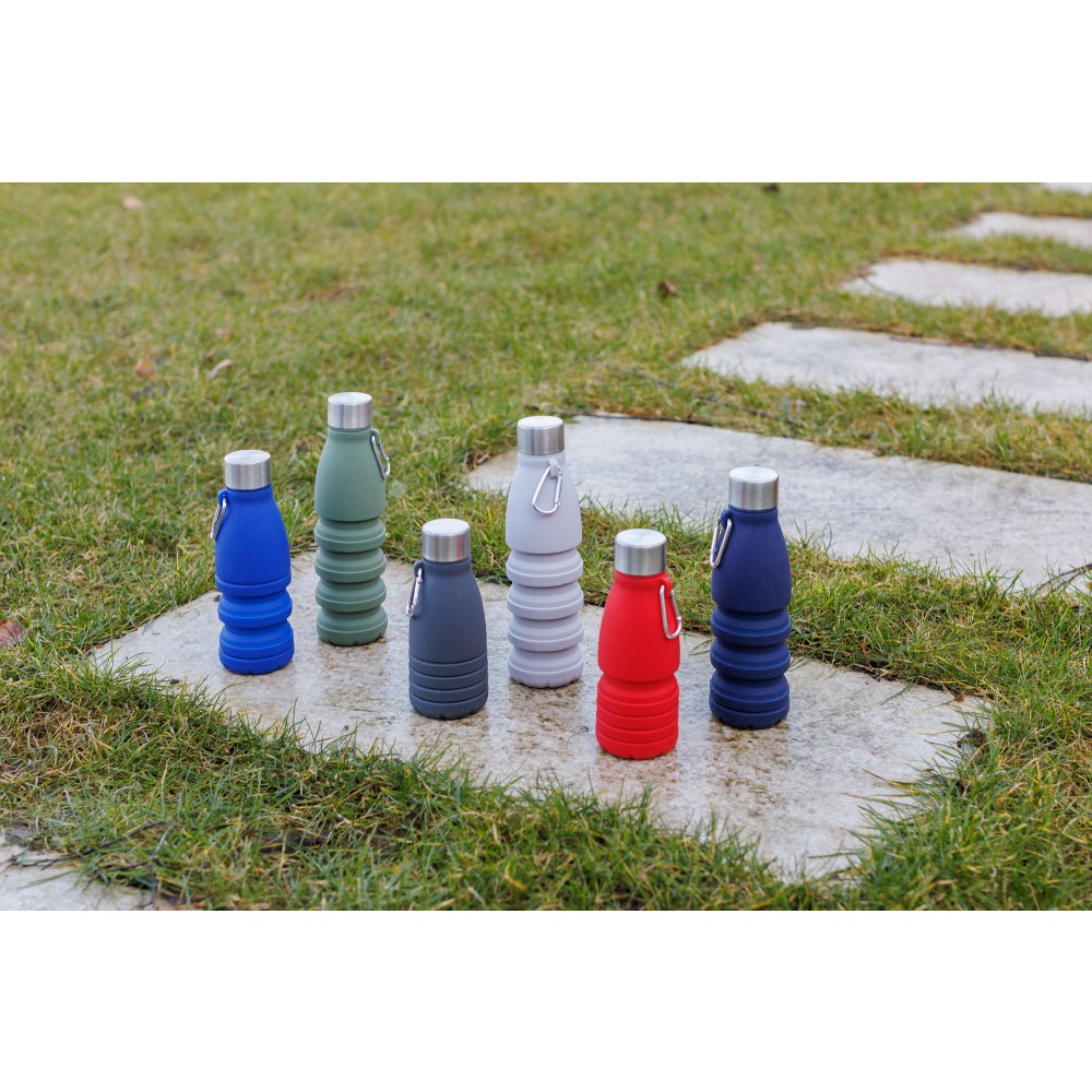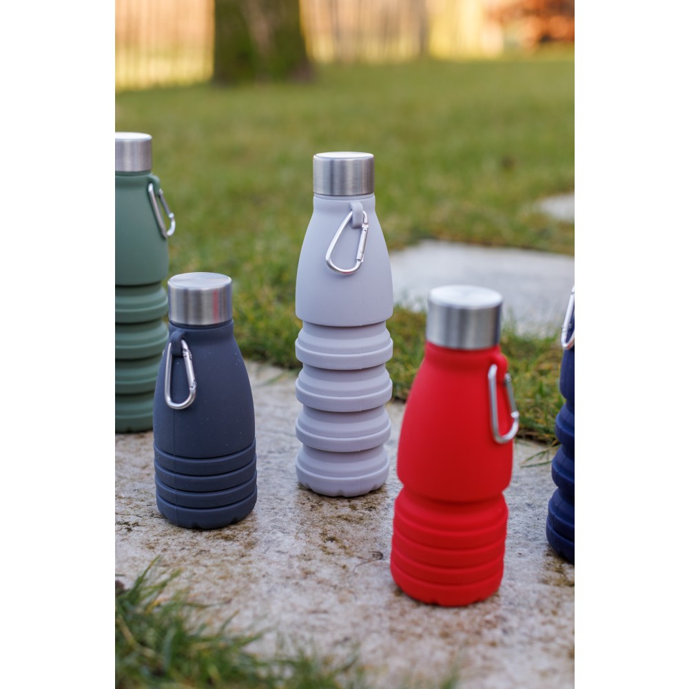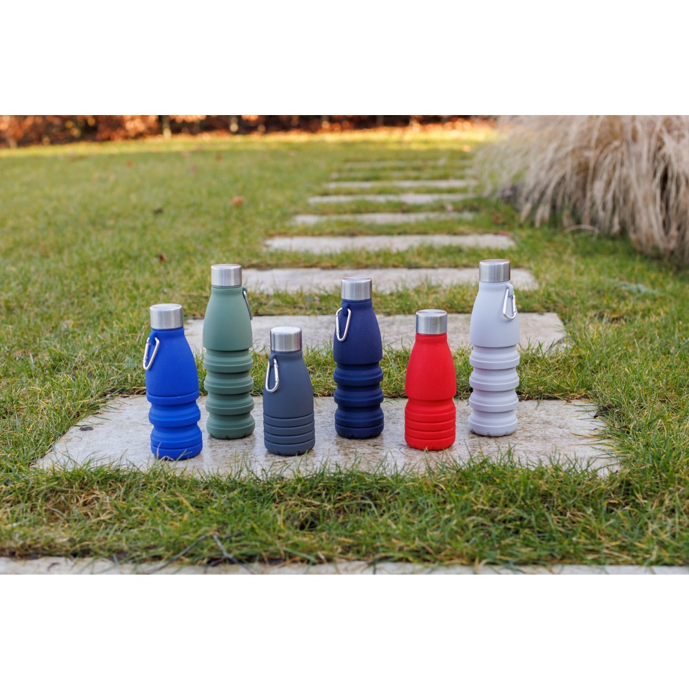 Összecsukható palack rozsdamentes acél fedéllel és alumínium karabinerrel. Összecsukott méret: d: 7x17 cm, kinyitott méret: d: 7x25 cm. Nincs egyenként csomagolva. Anyaga: szilikon. Űrtartalom: 550 ml. Emblémázás: Gravírozás