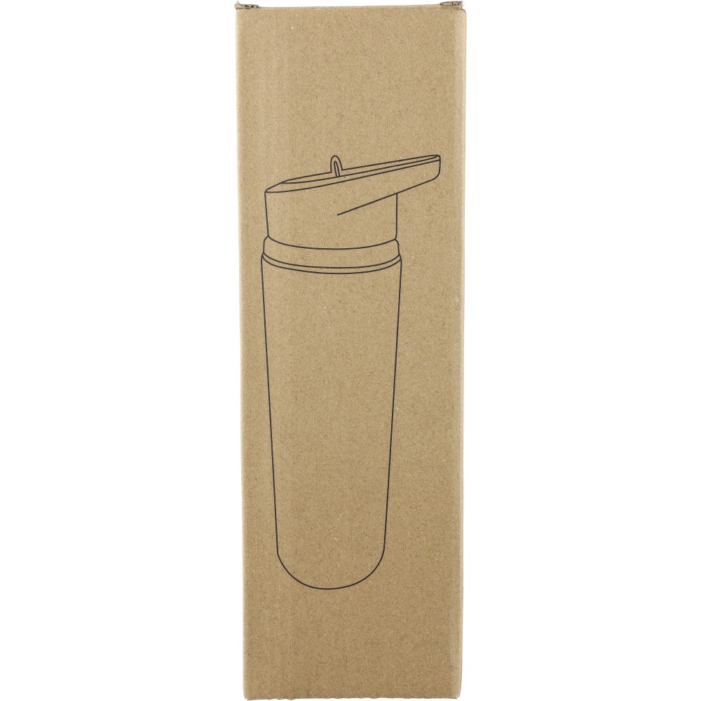 Újrahasznosított rozsdamentes acélból készült, egyfalú ivópalack rozsdamentes acél 304 anyagból, PP csavaros kupakkal, hordozófüllel, felhajtható ivószárral és belső szívószállal. Kizárólag hideg italokhoz használható, űrtartalma 500 ml. A palacktesten gravírozott recycled (újrahasznosított) alapanyagra utaló logó található. Darabonként barna kartondobozba csomagolva. Emblémázás: Bögredekor