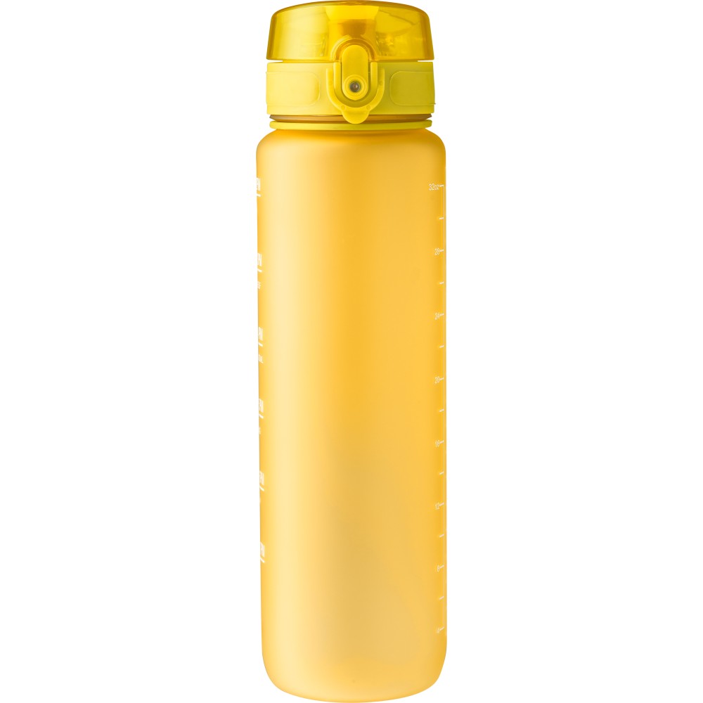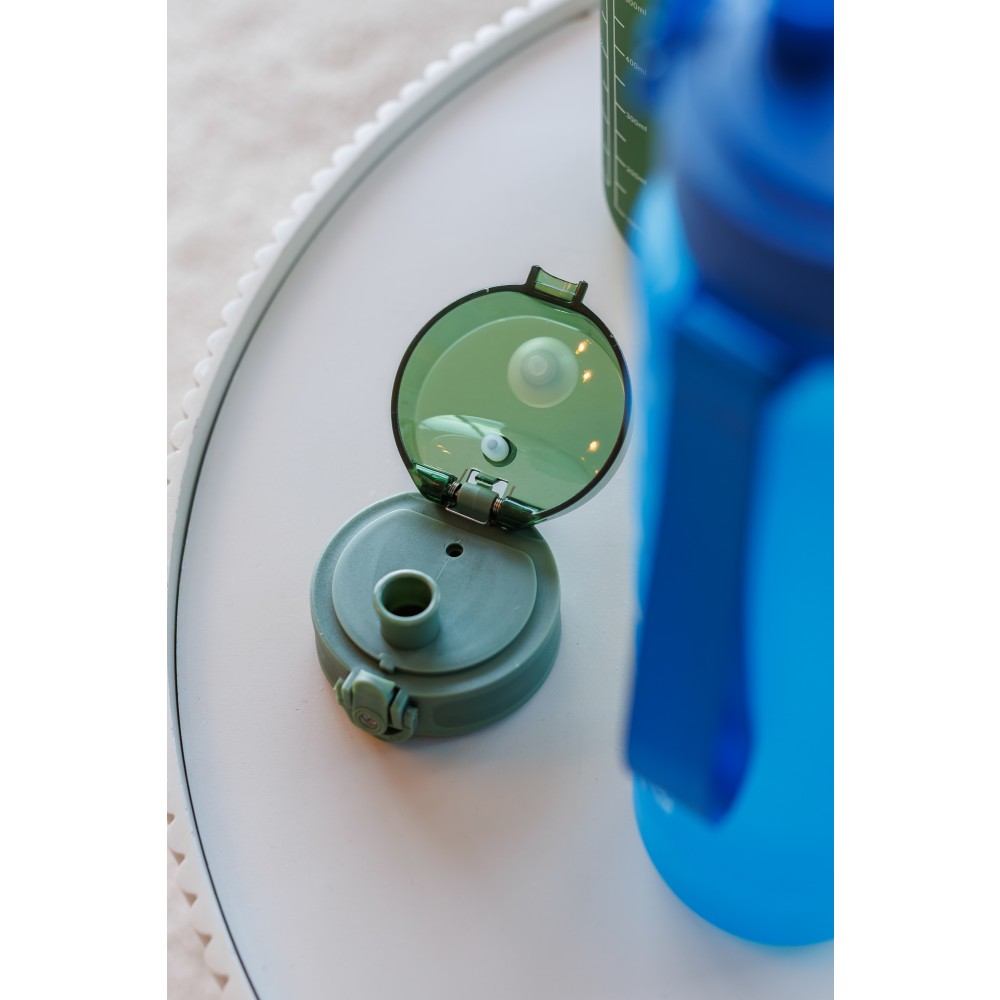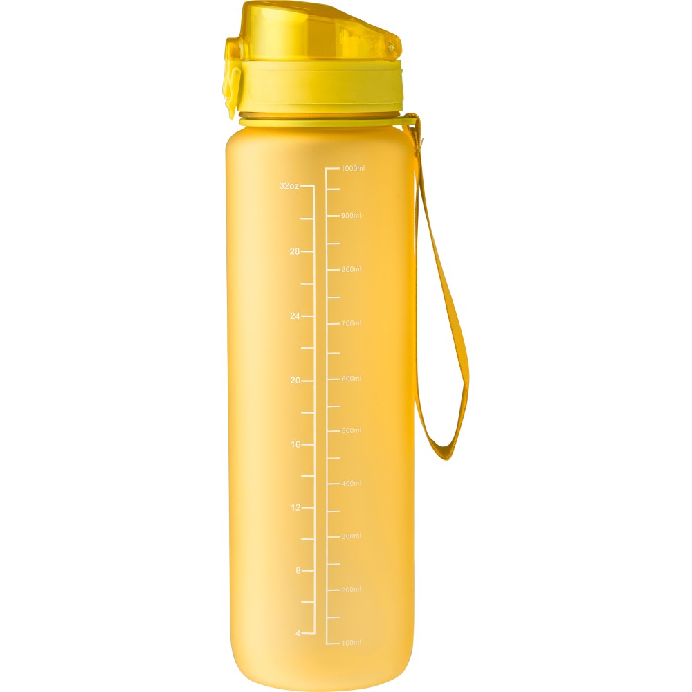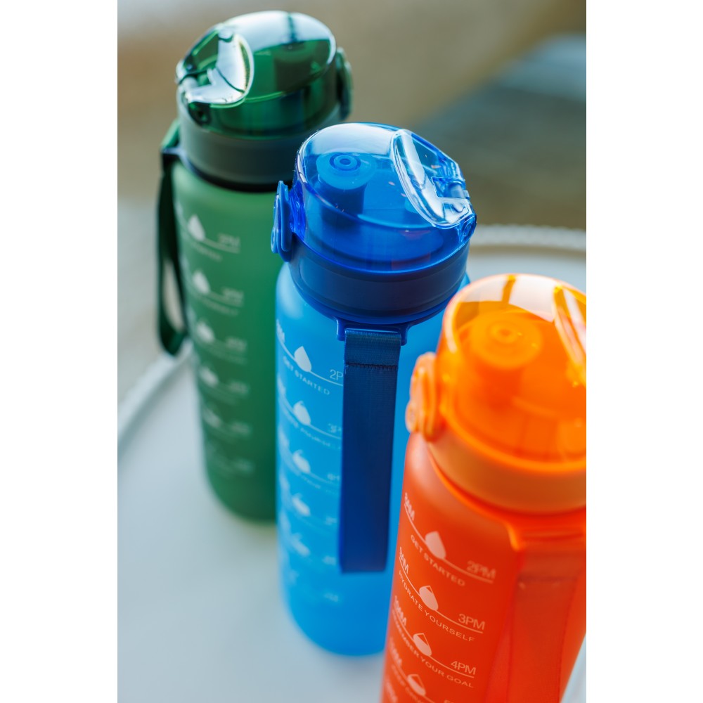 Műanyag motivációs palack szivárgásmentes kupakkal, csuklópánttal, matt bevonattal. Oldalán beosztással. Űrtartalom: 1 liter. Emblémázás: Tamponnyomás, UV nyomtatás