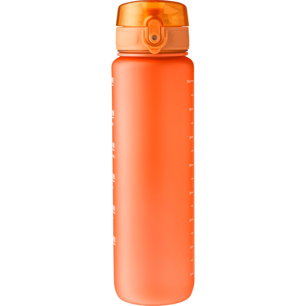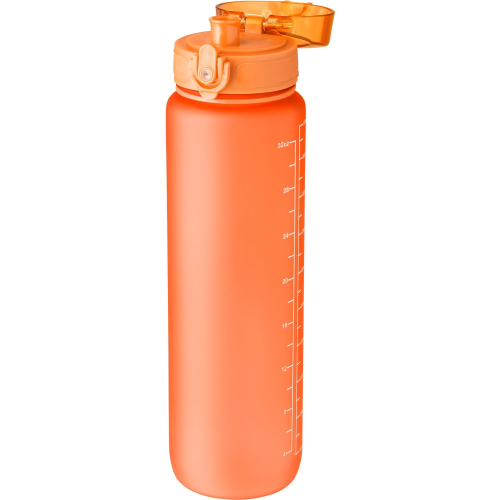 Műanyag motivációs palack szivárgásmentes kupakkal, csuklópánttal, matt bevonattal. Oldalán beosztással. Űrtartalom: 1 liter. Emblémázás: Tamponnyomás, UV nyomtatás