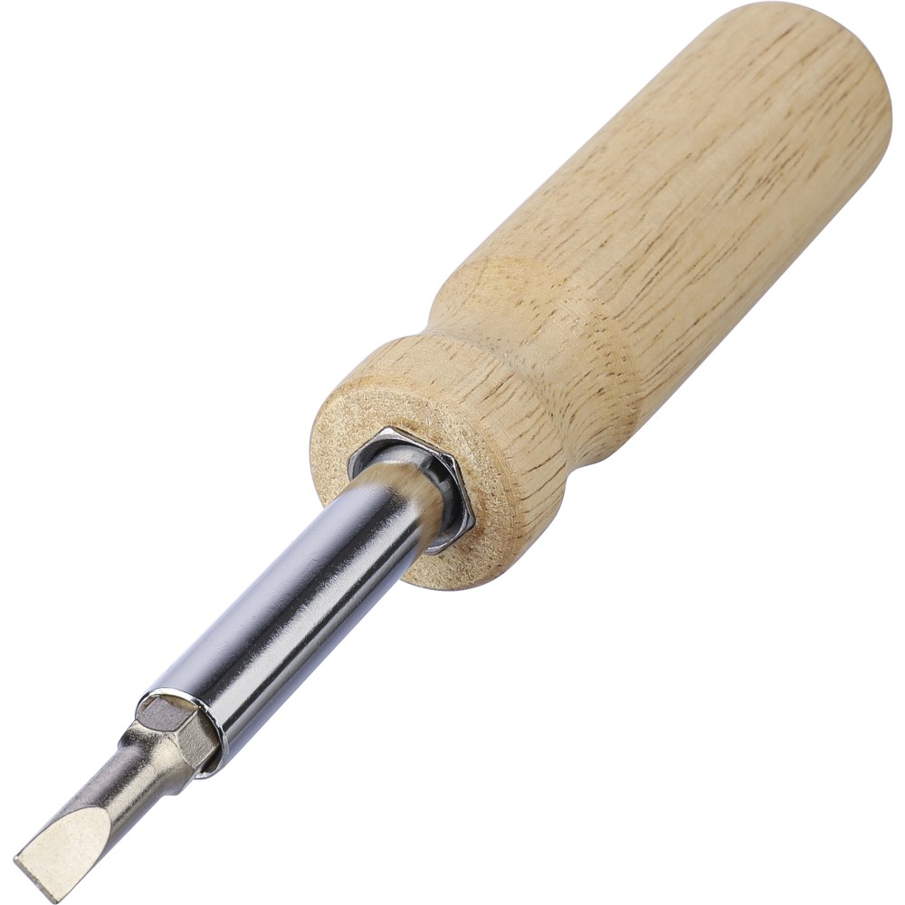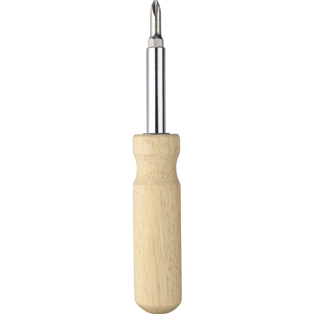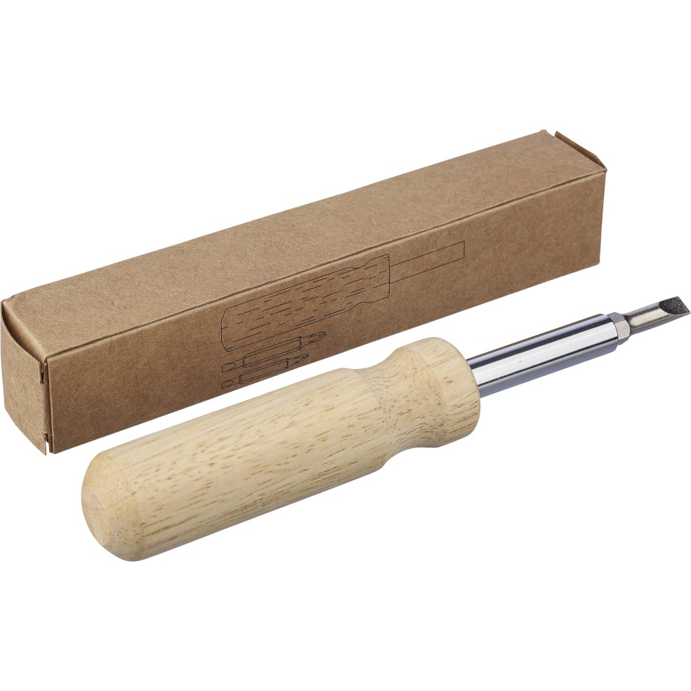 Kaucsukfa csavarhúzókészlet a nyélben tartható 4 db mágneses fejjel (2-2 db mindegyik kétoldalas hegyen). Praktikus és kompakt kialakítás cserélhető fejekkel és tartóval. Csomagolása barna papírdoboz. Emblémázás: Gravírozás