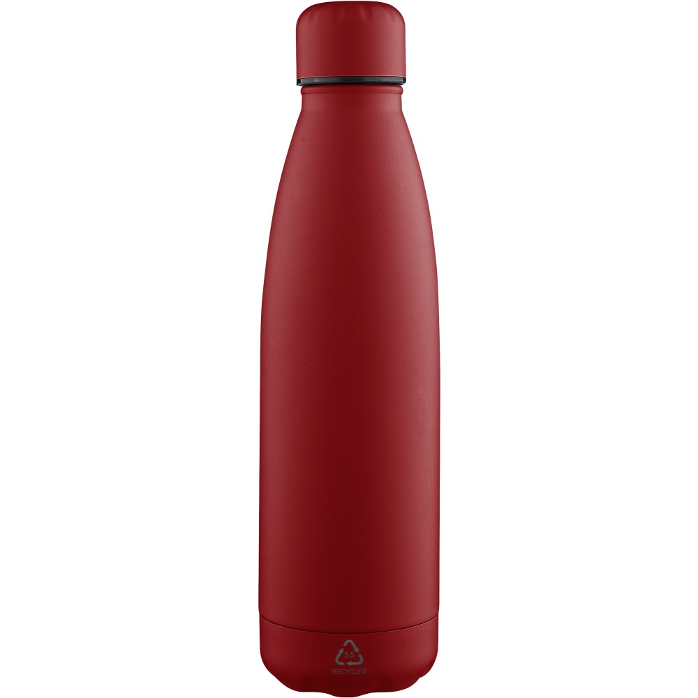 Újrahasznosított rozsdamentes acél ivópalack 500 ml-es űrtartalommal. Duplafalú szigetelés, amely akár 12 órán át melegen vagy hidegen tartja az italokat. A 304-es rozsdamentes acél belső kiváló tartósságot, rozsdaállóságot és biztonságos élelmiszer-érintkezést garantál. Selymes matt színű felülettel. A csavaros fedél és az aljzat színben egyezik a tiszta, egységes megjelenés érdekében. A palack elülső részén gravírozott újrahasznosított logó található. Egyenként, barna kartondobozba csomagolva.