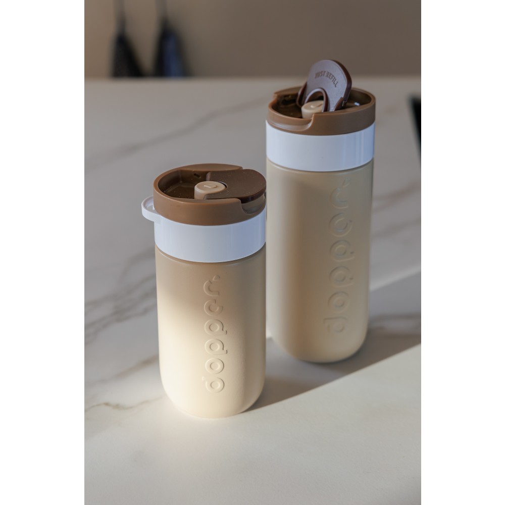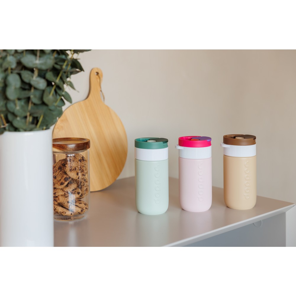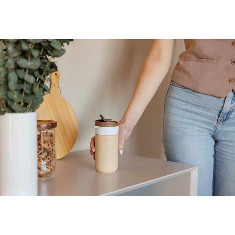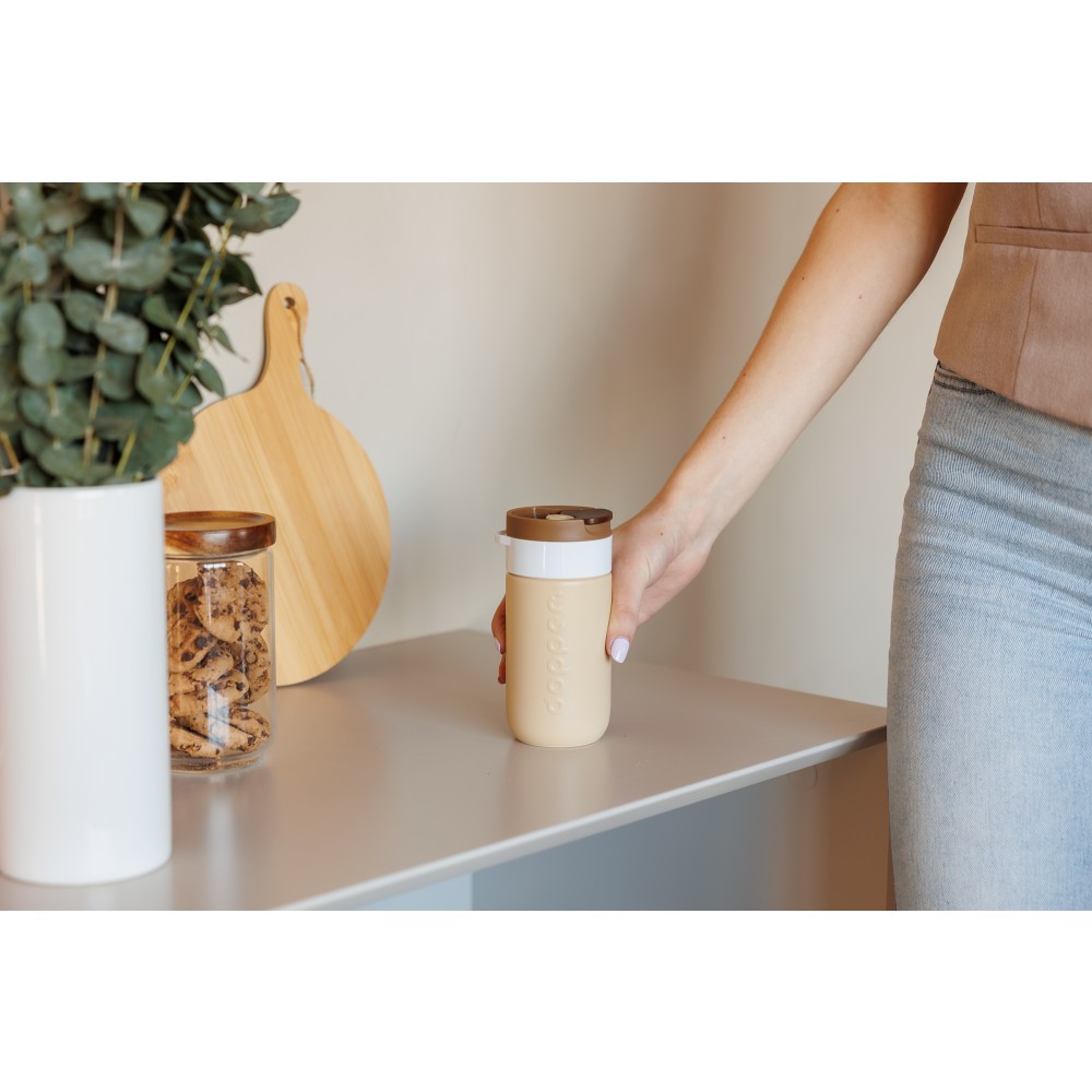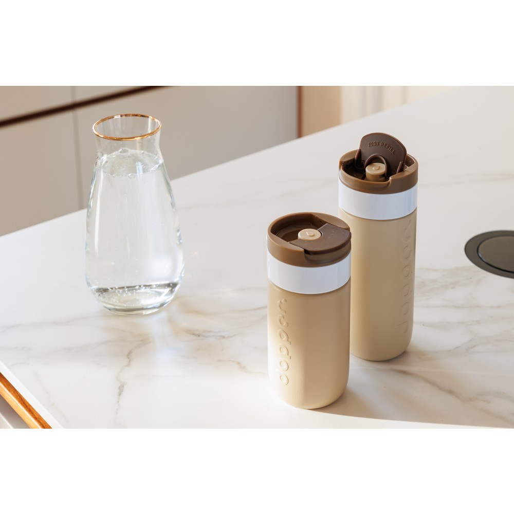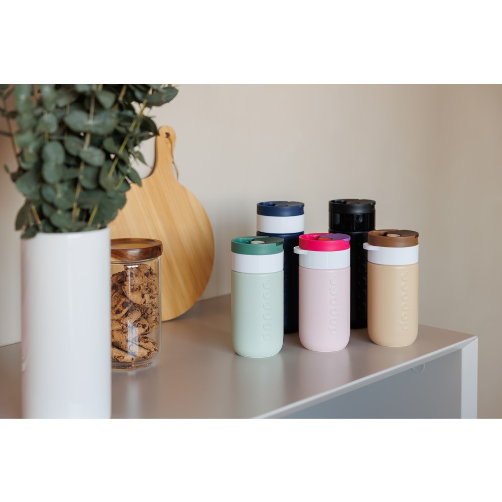 Legyen szó reggeli kávéról, napközbeni hidratálásról vagy egy esti szénsavas italról, ezt a Dopper Travel Mug-ot úgy tervezték, hogy mindenre alkalmas legyen. A meleg italokat akár 6 órán át melegen, a hideg italokat pedig 20 órán át hűvösen tartja. Duplafalú, 90%-ban újrahasznosított rozsdamentes acél testtel és tartós bevonattal készült. A könnyen nyitható, lepattintható kupak egyszerűvé és kényelmessé teszi a használatot útközben is. Mosogatógépben (emblémázás nélkül) 65 °C-ig tisztítható. Kérjük, vegye figyelembe, hogy kávé vagy tea használata esetén elszíneződés vagy szagmaradvány előfordulhat. Forró italok fogyasztásakor járjon el óvatosan!