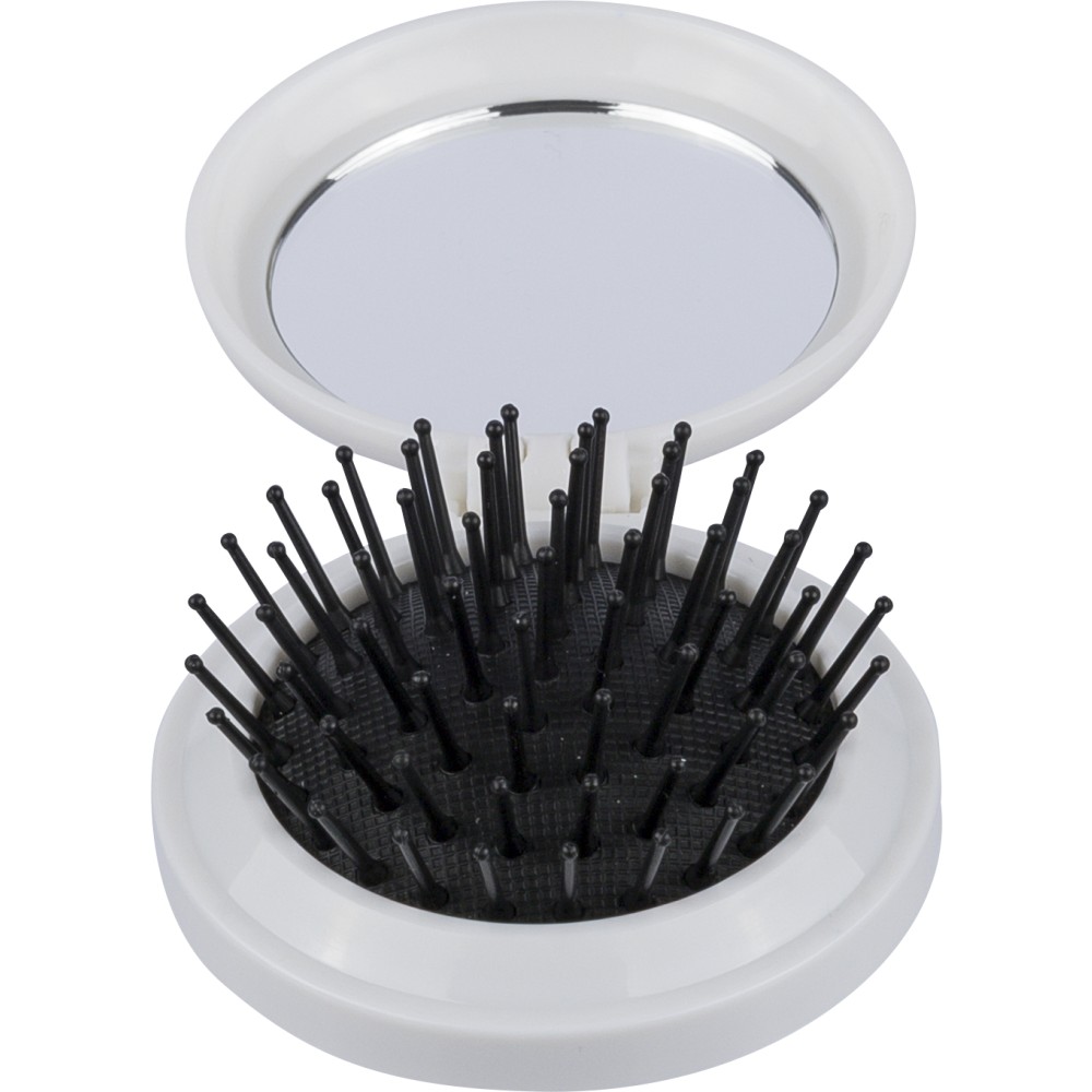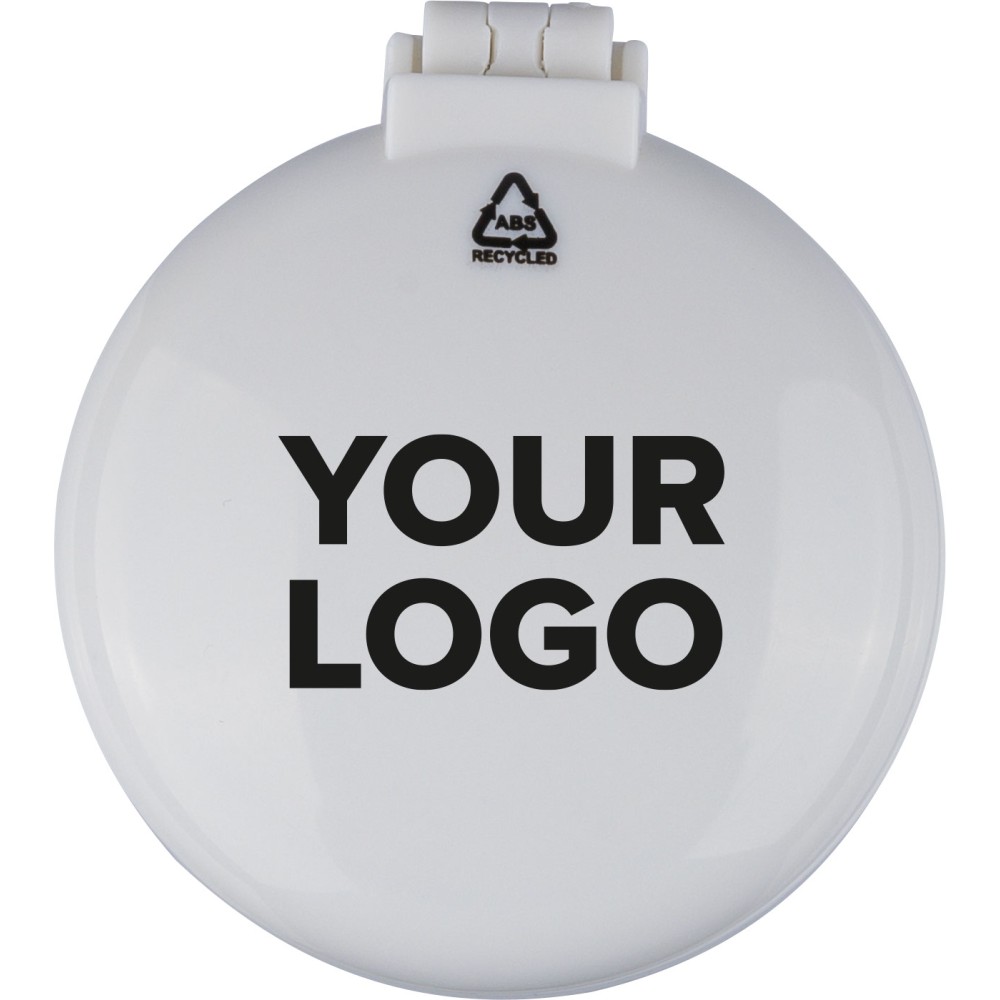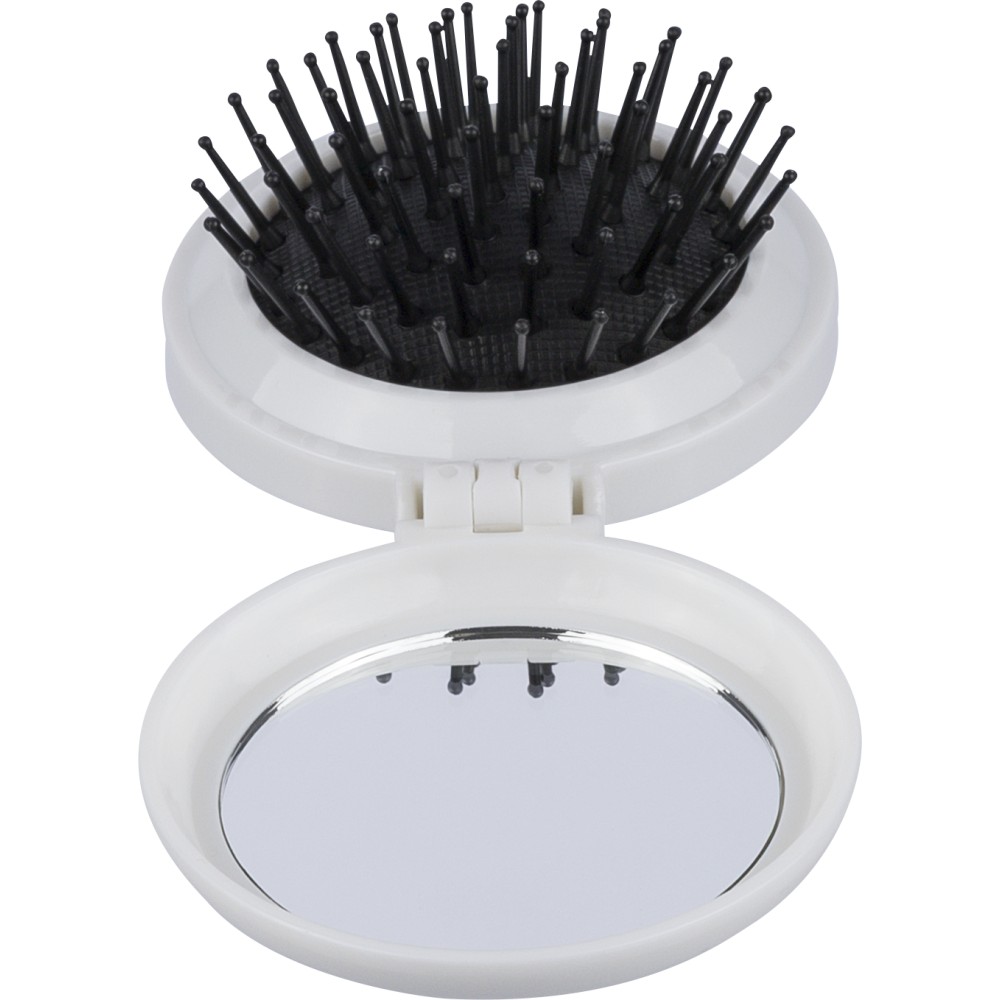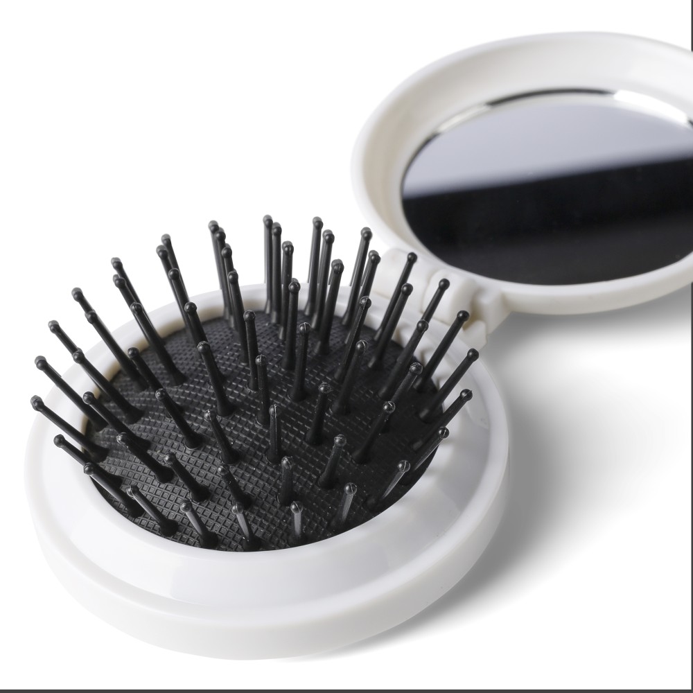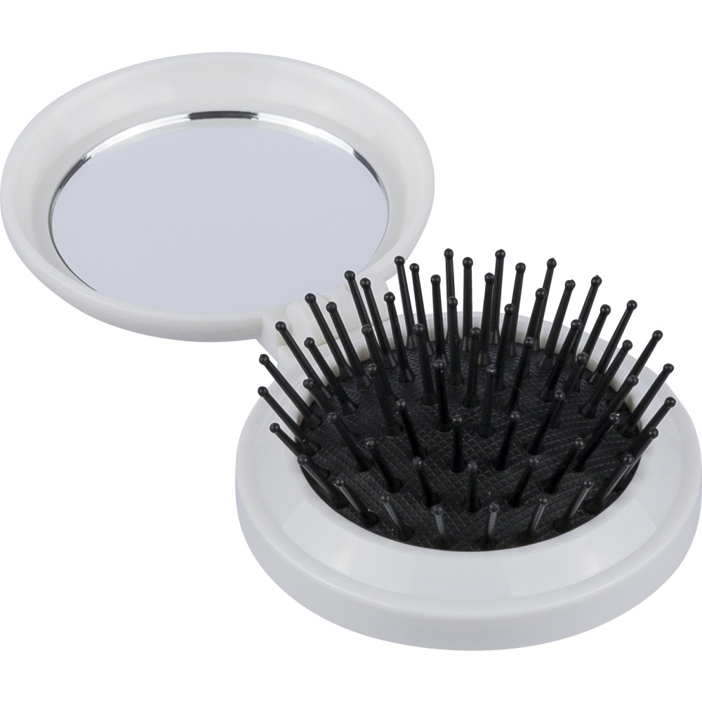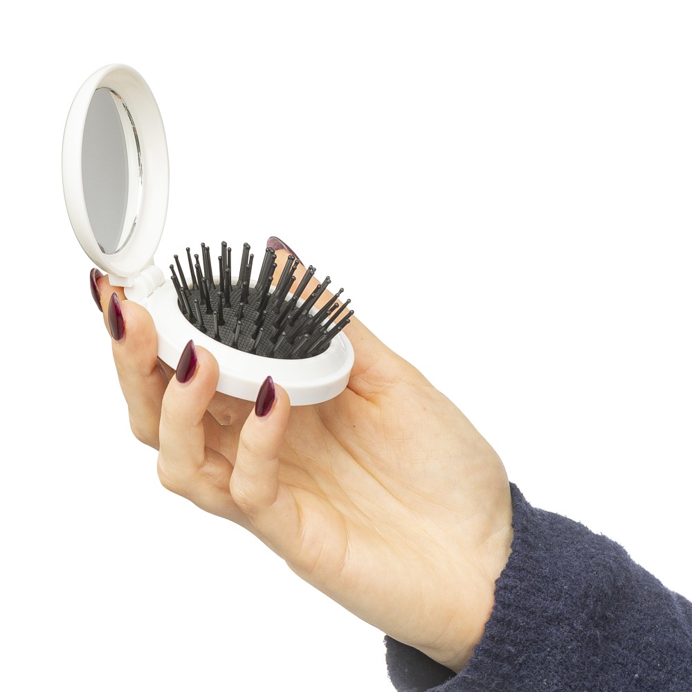 Újrahasznosított ABS-ből hajkefe és tükör, praktikus kialakítású útközbeni használatra, a terméken újrahasznosított alapanyagra utaló megjelölés található. Emblémázás: Tamponnyomás