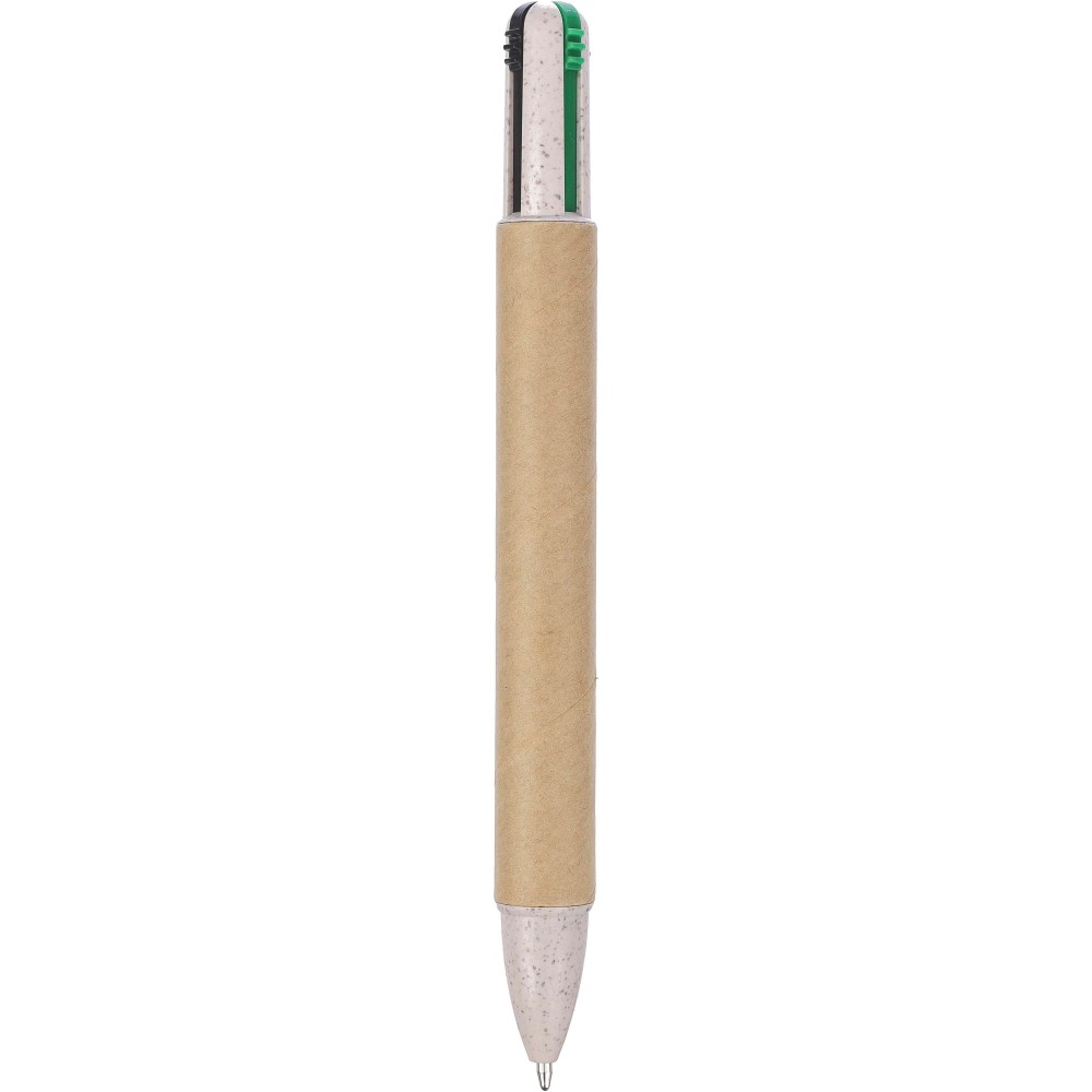 Újrahasznosított kartonból és szalmából készült négyszínű golyóstoll. Kb. 300 méter íráshossz színenként. Tollbetét színek: kék, fekete, piros és zöld. Emblémázás: Tamponnyomás, UV nyomtatás